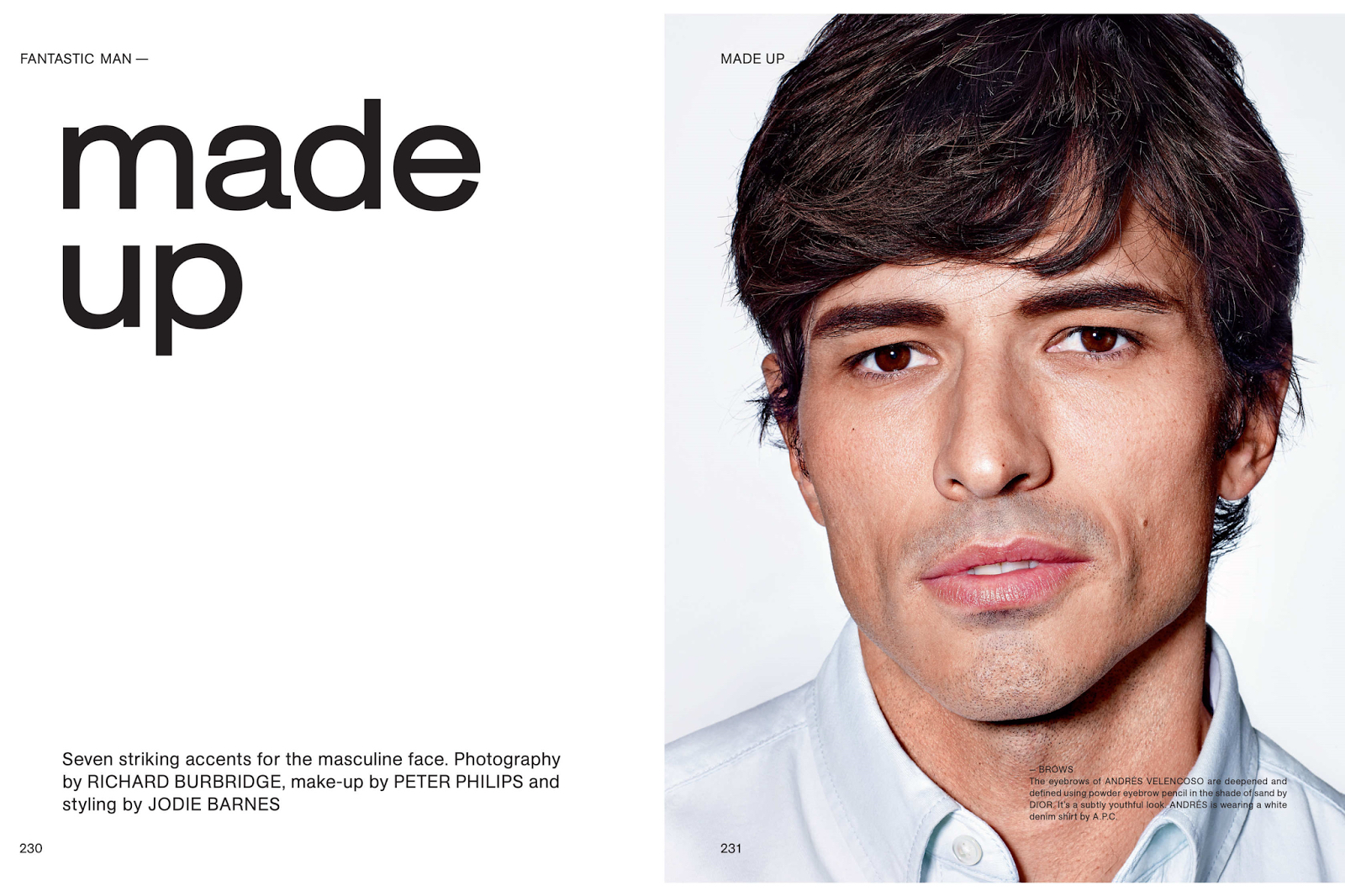 Fantastic Man delivers quite the cheeky spread for its spring-summer 2015 issue. Leading Spanish model Andres Velencoso Segura gets made up. Connecting with makeup artist Peter Philips, Andres is introduced to makeup staples, wearing blush, lipstick and more. Photographed by Richard Burbridge and styled by Jodie Barnes, Andres showcases seven makeup accents. Talking to The Cut about the eccentric spread, Fantastic Man co-founder Jop van Bennekom shares, “It’s a very simple idea. It’s just giving makeup a chance. It’s just like applying female basics on a man’s face. It’s fun, it’s silly, but it’s also a little bit liberating. It’s shot almost as a manual, like let’s try out a lip or an eye makeup look. Men are more limited in a way, but women can accentuate whatever they have. For men, wearing green socks is kind of risky.”