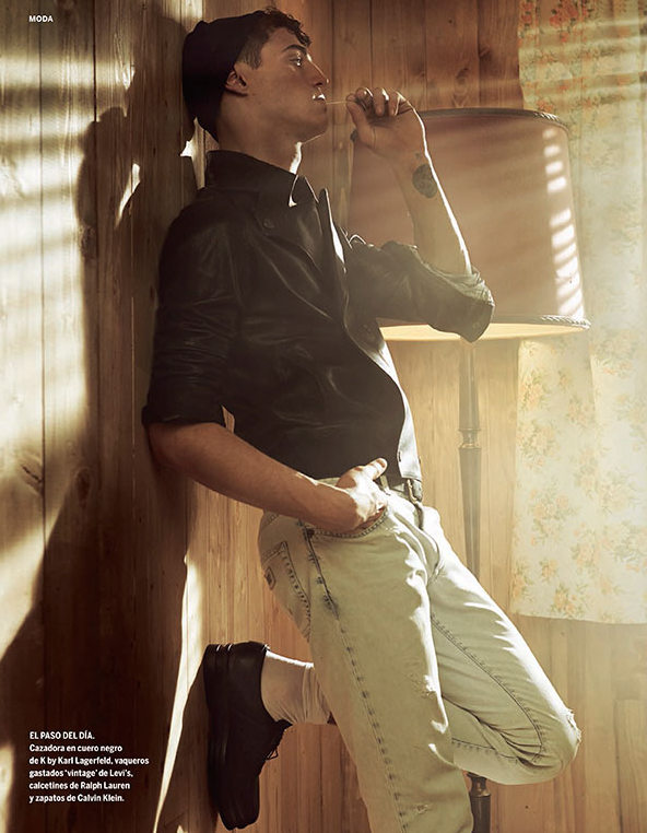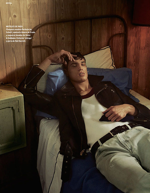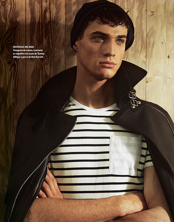 Rebel Revamped–Once again, photographer Giampaolo Sgura and fashion editor Miguel Arnau join creative forces to realize a stunning editorial, featured in Spanish magazine El País. Inspired by the always appealing figure of the charming rebel à la Marlon Brando, mixed with the seasonal trend of fashionable nautical stripes, Sgura captures model Andy Walters (WhyNot) in leather jackets, jeans, striped numbers, basic white tees and traditional sailor black caps, providing images pervaded by a strong cinematic allure. / Hair by Andrew Guida (CloseUp Milano). Makeup by Laura Stucchi (CloseUp Milano).