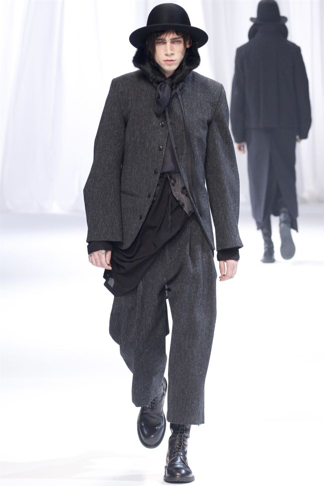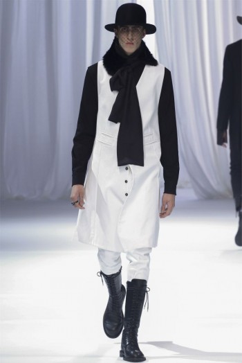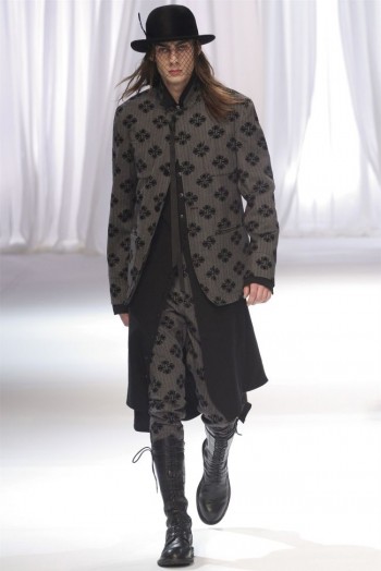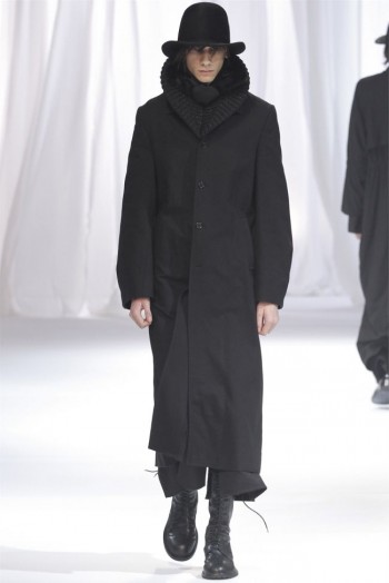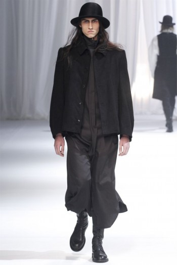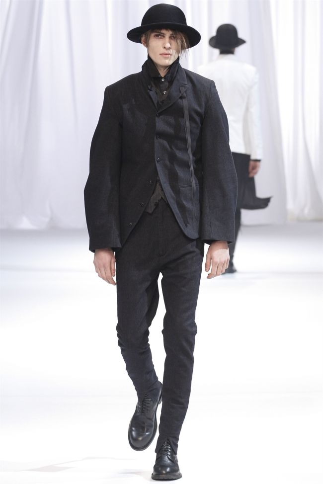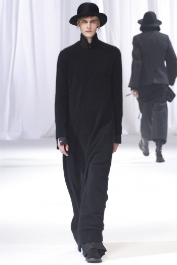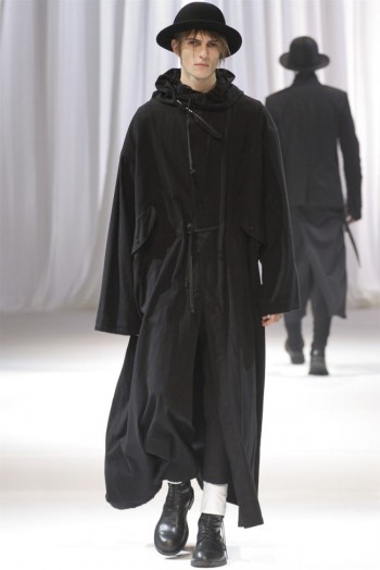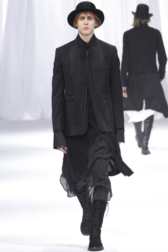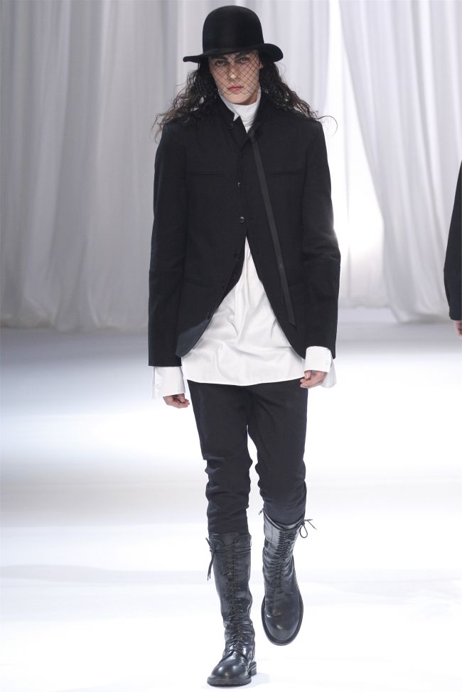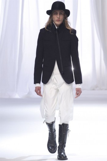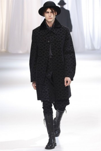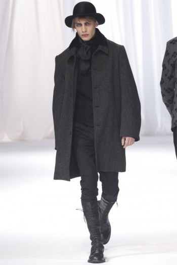 Victorian Revival–Forever the dark romantic, Ann Demeulemeester evokes images of late twentieth century England with an unmatched edge. Dressed in soft layers of black and white, elongated blousons, fitted waistcoats and long flowing overcoats contributed to the wardrobe of today’s dandy. Finished with ribbon, loose sleeves and leather boots, the man of Ann Demeulemeester marches with the utmost style into the fall/winter 2013 season with elegance and grace.