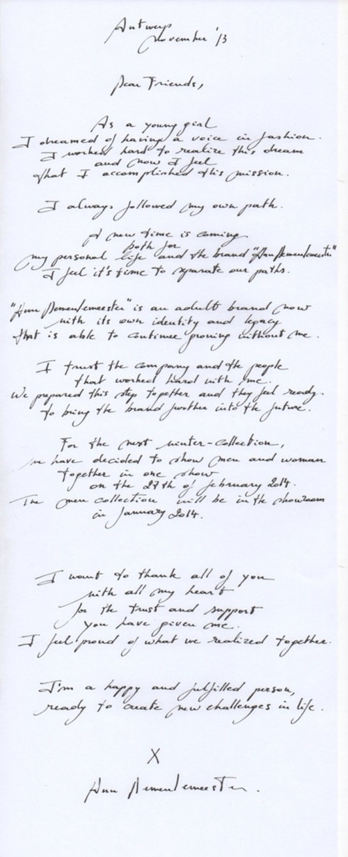 Refined Work–Approaching her spring/summer 2014 collection with as much casualness as her refined man can possess, Ann Demeulemeester reinterpreted past design ideas, blending it with a new renaissance man. Furnished in both black and red, vertical stripes were back with a vengeance covering trousers, coats and other Demeulemeester essentials. Meanwhile, ornate prints crept up, playfully shifting position, adding a certain decadence to the Belgian designer’s man of three-piece suits.