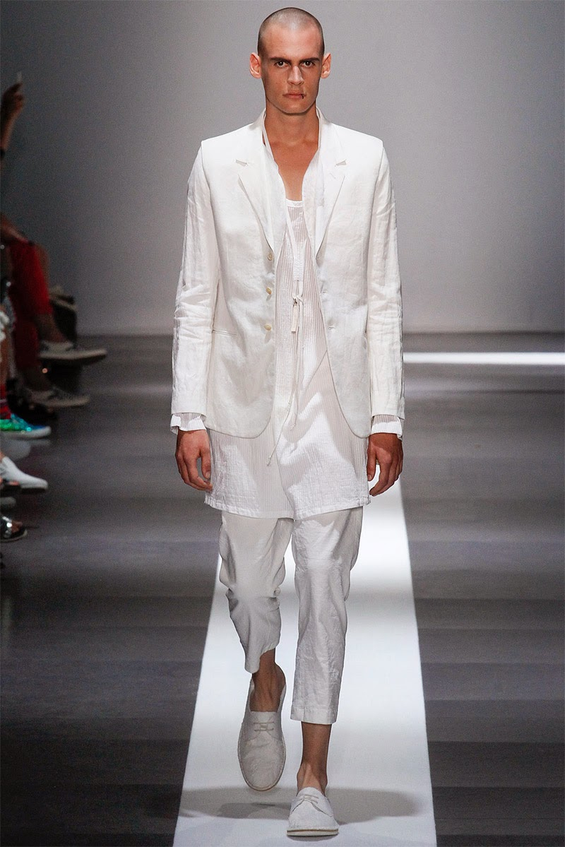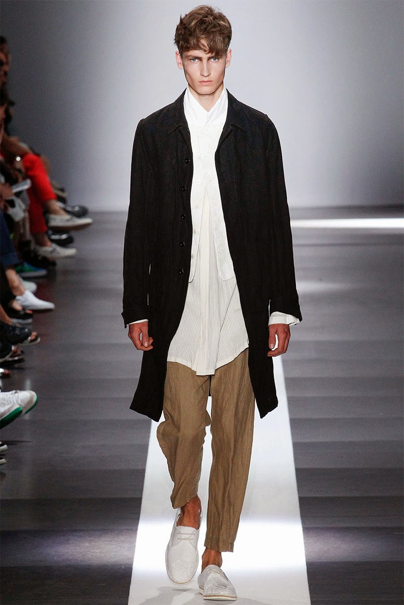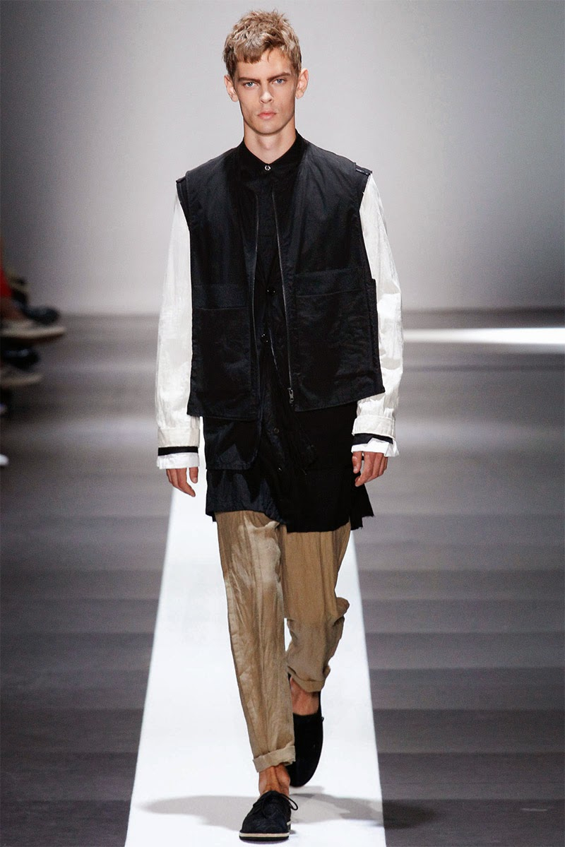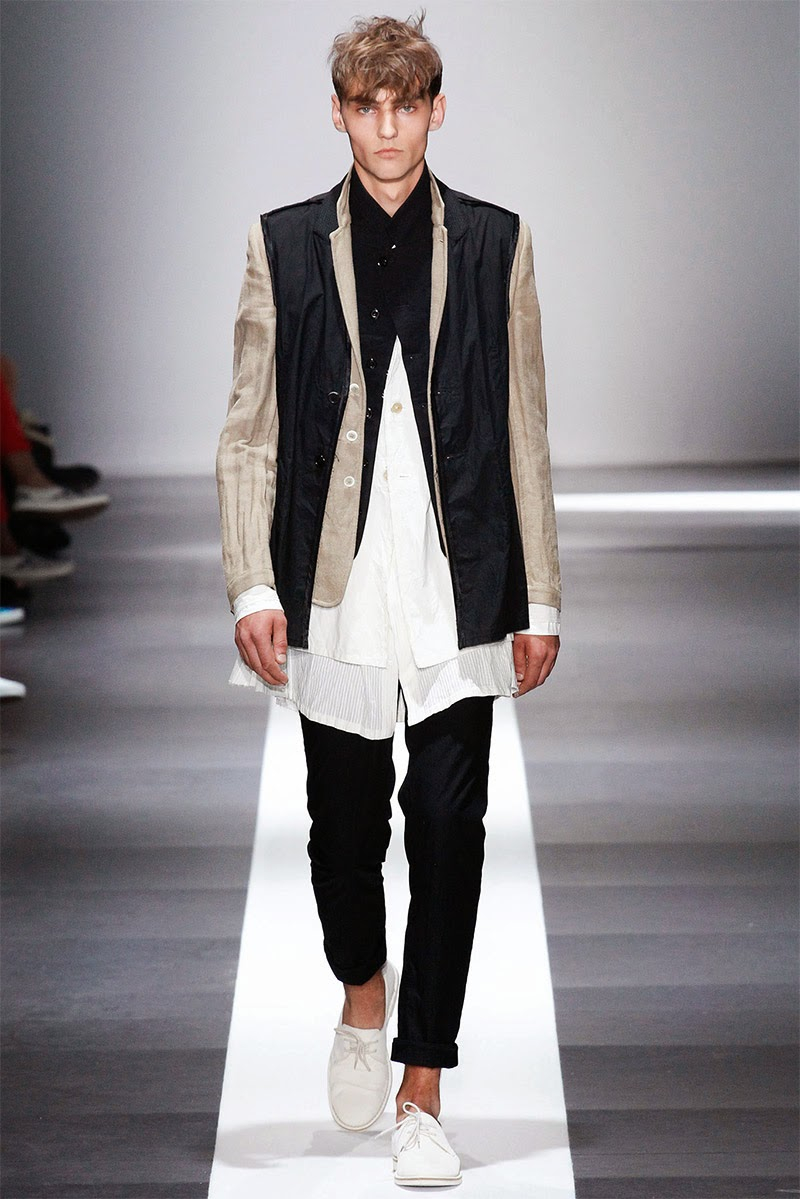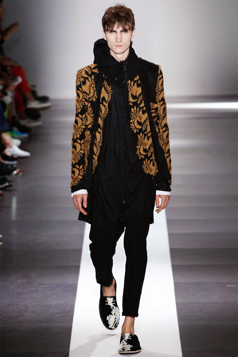 Ann Demeulemeester Spring/Summer 2015–Designer Sébastien Meunier officially took the helm of Ann Demeulemeester as creative director with his spring/summer 2015 menswear collection shown during Paris Fashion Week. Simple and within house DNA, Meunier’s latest work for the label stripped it down to the silhouette and layers Ann Demeulemeester is known for. Light and relaxed, long coats, tailored waistcoats and elongated tops came together with a monochromatic color scheme at large. Gently touching upon stripes and other prints, another element of the collection was its lightness, shown with sheer fabrications and the success of chic summer layering.