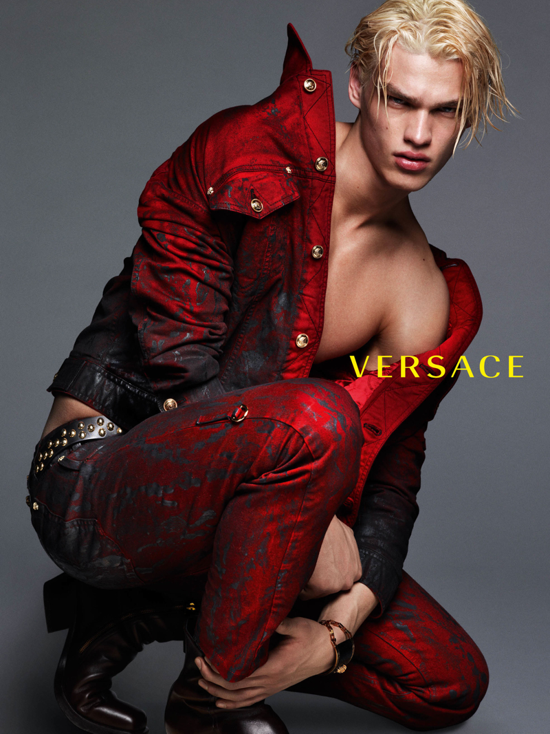 The Bold Versace Man–After yesterday’s campaign preview, we have another image from Versace’s fall/winter 2014 advertisement, which was photographed as usual by Mert & Marcus. In the new image, model Filip Hrivnak kneels down for a great pose that showcases not only Versace’s treated red denim, but a fantastic pair of leather boots. For another image released previously, Filip joins Daan van der Deen in leather and chaps for a daring image styled by David Bradshaw. Dontella Versace realizes it’s a bold men’s look but explains “The men’s campaign stands for a man’s right to be whoever he wants to be.”