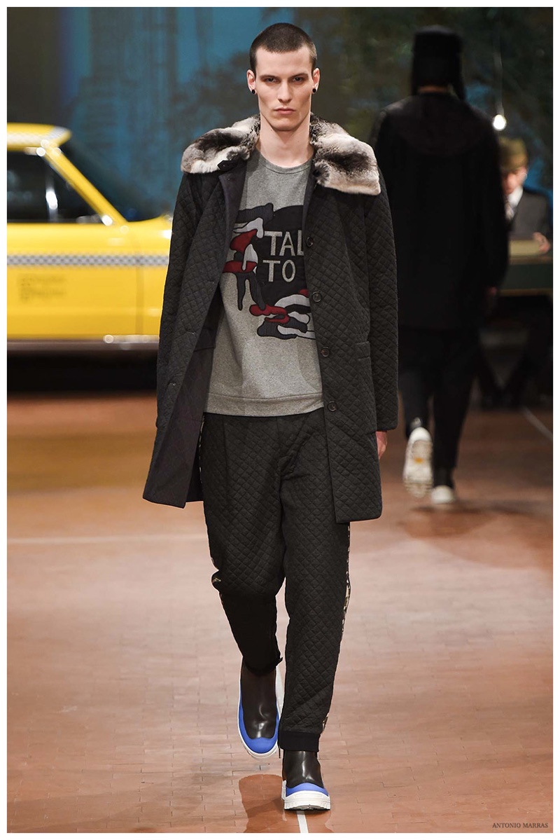 Designer Antonio Marras combined references for his fall-winter 2015 menswear collection, finding inspiration in Sardinian artist Constantino Nivola and the famous Robert De Niro film Taxi Driver. The inspirations came together seamlessly with Nivola moving to the Hamptons and the urban grit of De Niro’s character, Travis Bickle. The results were brilliant with a balancing act of vintage references and modern pacing. Dressed for the urban jungle, Marras played with textiles as usual, embracing patched together jackets and coats. Relaxed tailoring on suits worked hand in hand with fantastic prints and fur accents. Touching on knitwear, layers came together in monochromatic schemes, while a new take on the camouflage print brought the collection full circle with a phenomenal execution.