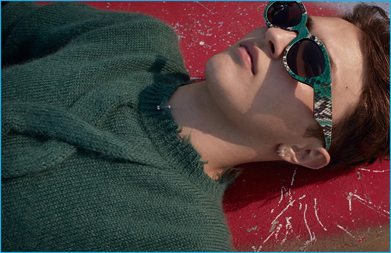 Anward Hadid relaxes in a green distressed sweater from Etro for Vogue Hommes Paris.Pin