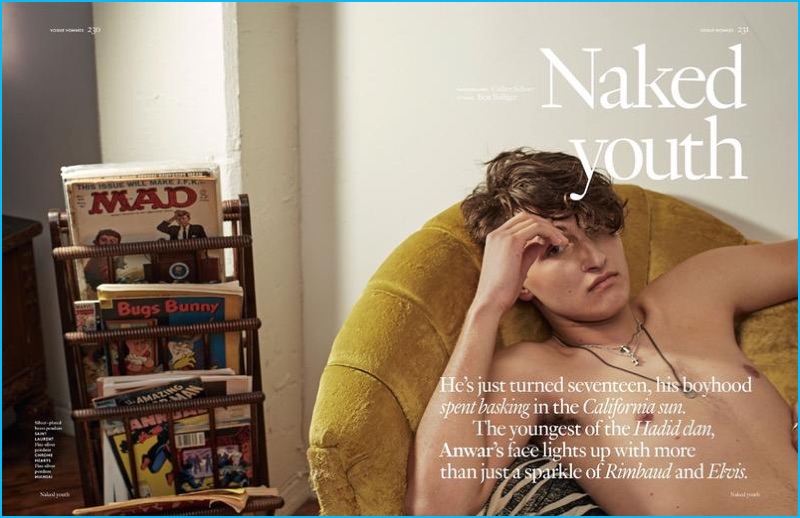 Anwar Hadid follows in the steps of his older sisters, Gigi and Bella, starring in a fall fashion editorial from Vogue Hommes Paris. Donning an eclectic wardrobe for the story, Anwar dons a variety of relaxed pieces. Styled by Beat Bolliger, Anwar is photographed by Collier Schorr. Embracing a nonchalant attitude, Anwar wears statement fashions from brands such as Prada, Coach, and Etro.
