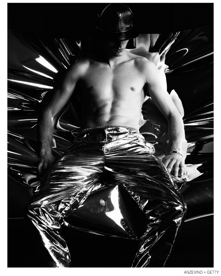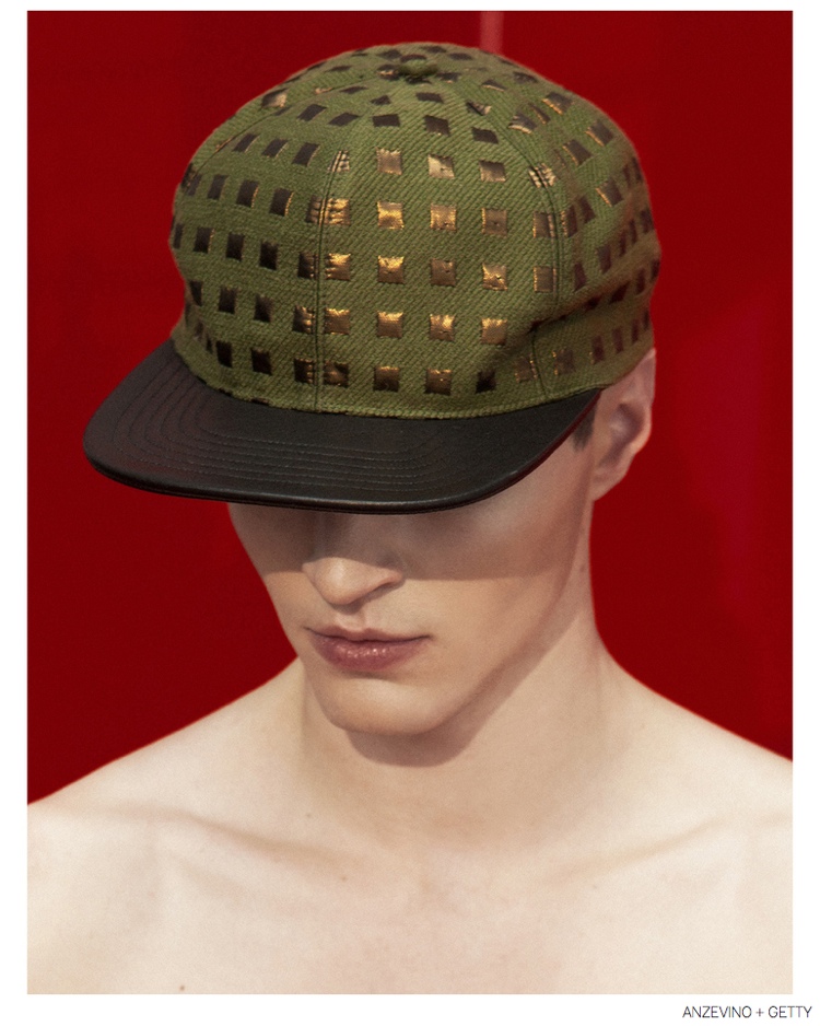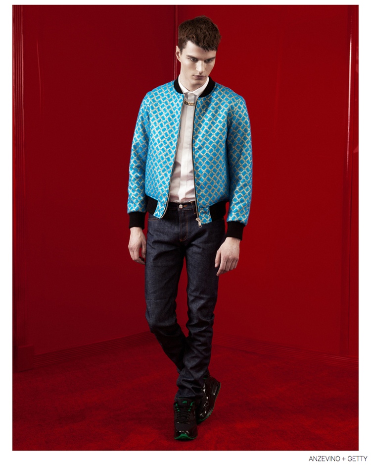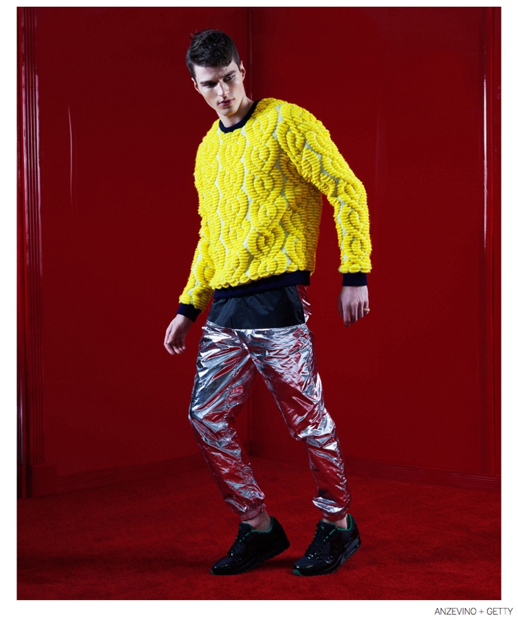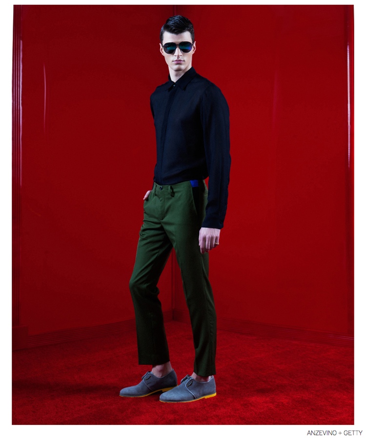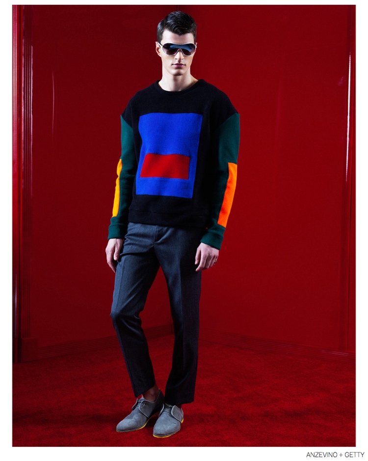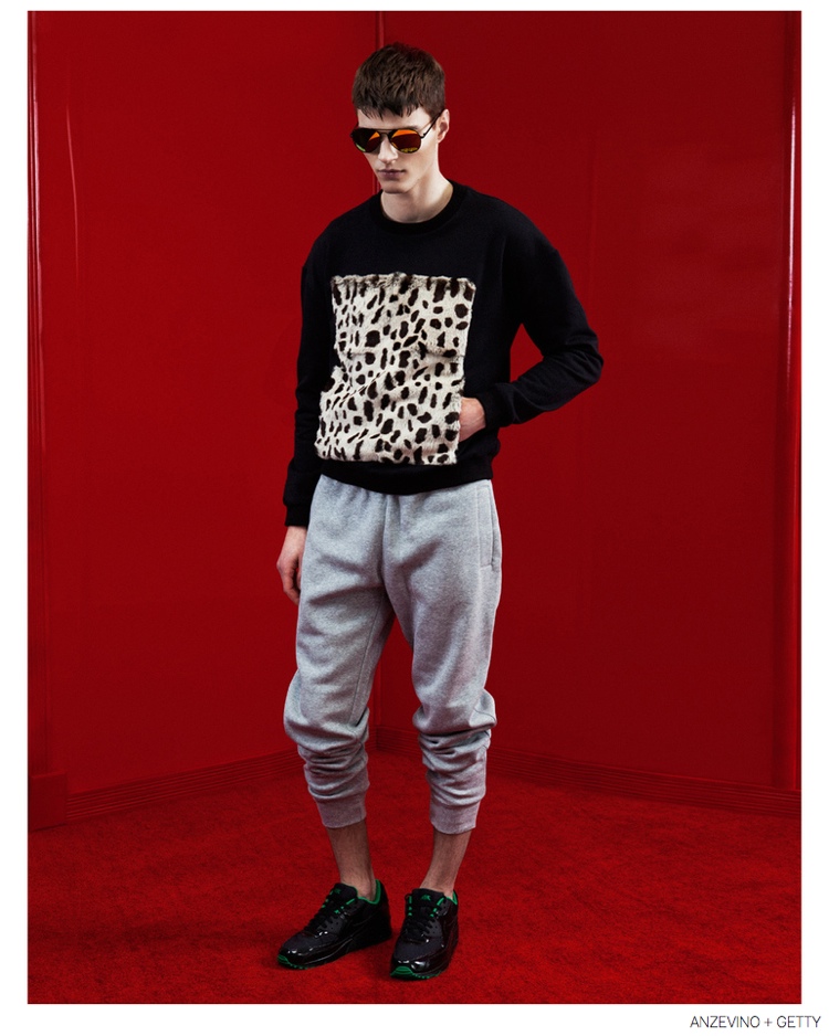 Anzevino + Getty Fall/Winter 2014-Model Arran Sly poses in a red room for the fall-winter 2014 lookbook of Anzevino + Getty. Designed by William Anzevino and August Getty, the lineup explores a fun, youthful attitude with bold prints and a splash of vibrant colors. Mixed with streetwear references, popular items like the modern sweatshirt are rehashed with fearless color blocking and the use of prints such as leopard. A metallic touch contributes to quite the statement pants while a clean silhouette provides chic style options that include dress shirts and slim-cut pants.