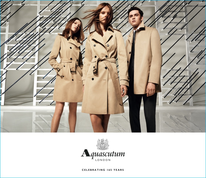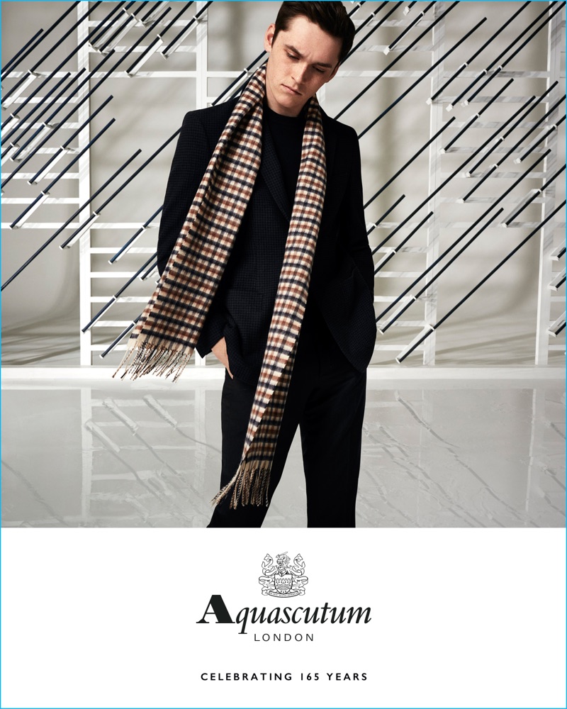 Approaching its fall-winter 2016 advertising campaign, Aquascutum celebrates its 165th anniversary and 40 years of the club check. Connecting with up and coming photographer Ash Reynolds for the occasion, the brand puts the spotlight on its signature pieces such as its tan trench coat and its luxurious scarves. Starring in both the print campaign and a video where he dances, British model Anders Hayward fronts the outing. Anders is also working on transitioning into acting with an upcoming E4 comedy entitled Foreign Bodies.