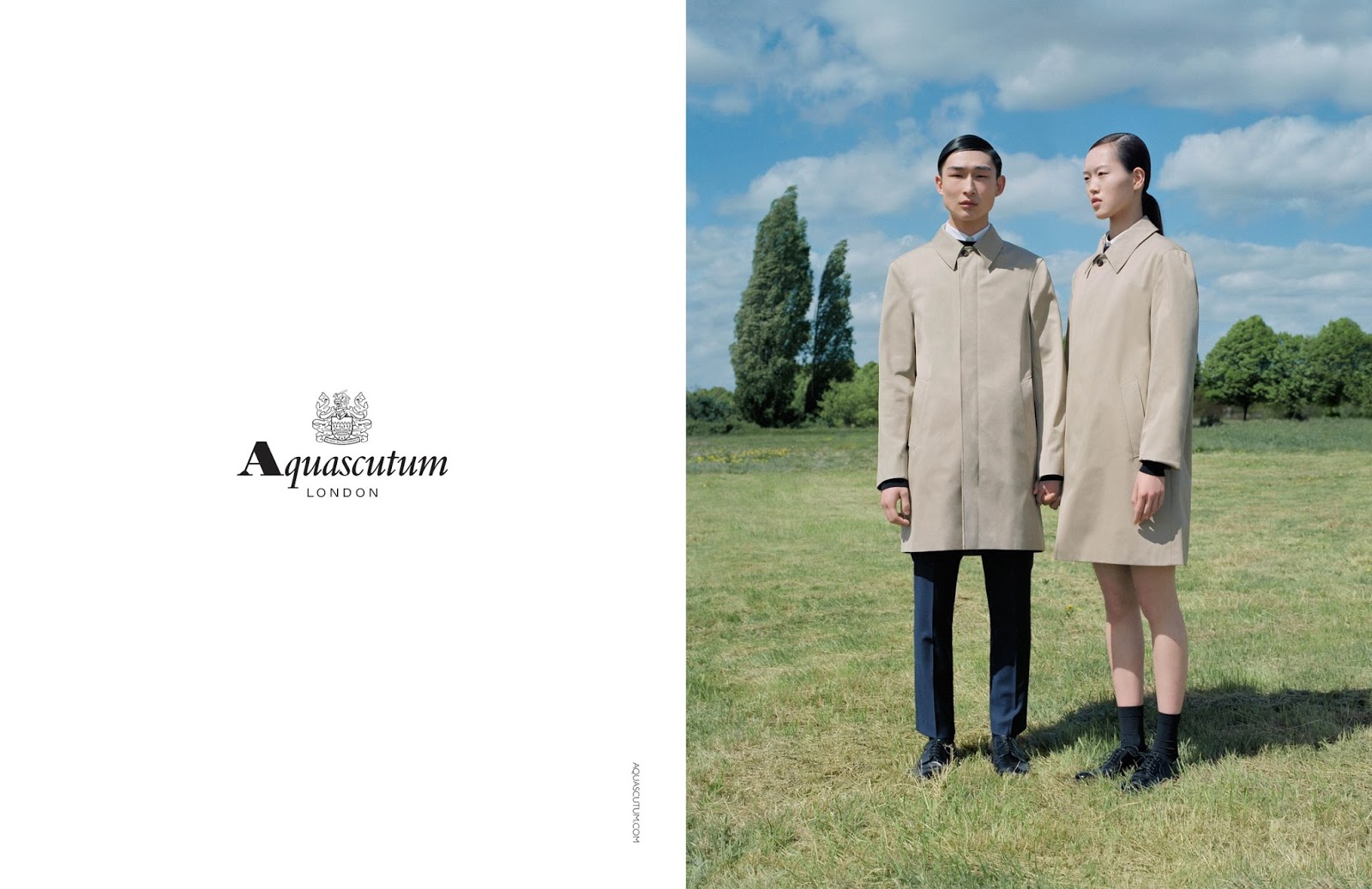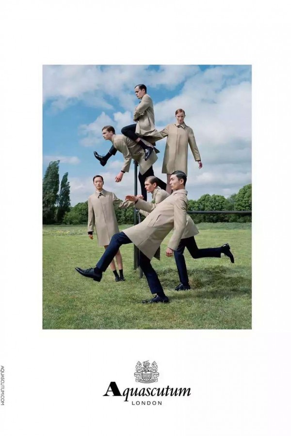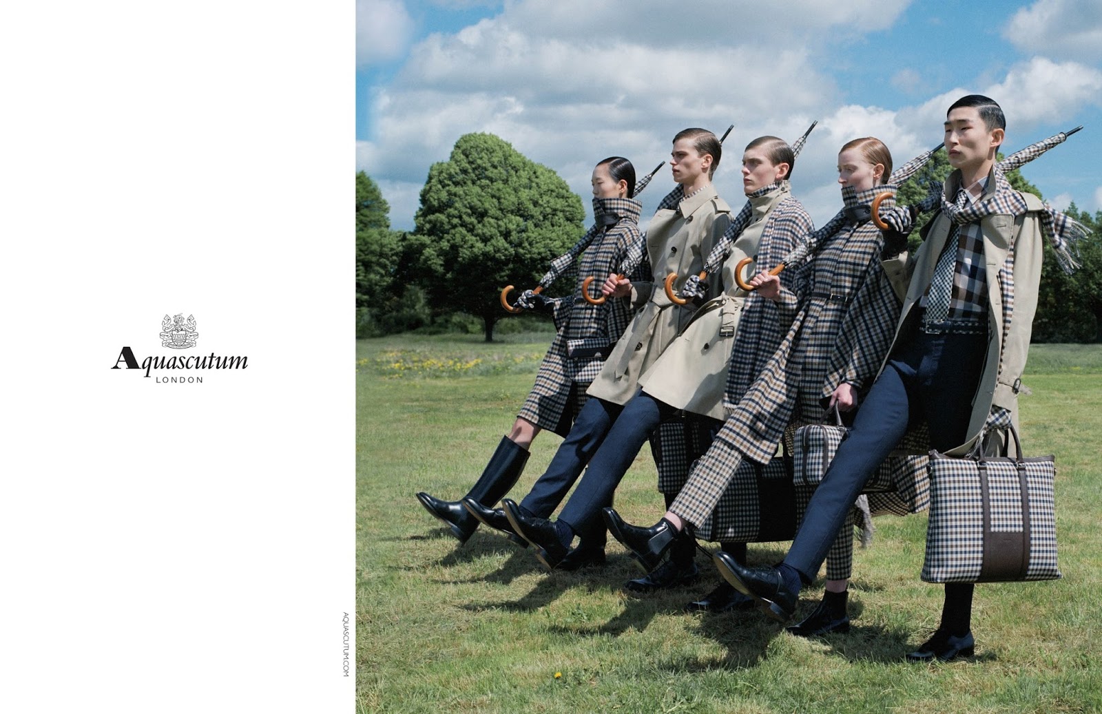 Collaborating with photographer Tim Walker for its fall-winter 2015 advertising campaign, Aquascutum returns to its quirky roots. Providing for a fun campaign outing, models that include Jake Love, Ollie Pallister and Sang Woo come together with an eccentric attitude, modeling Aquascutum’s timeless fashions such as the Mac and trench.
