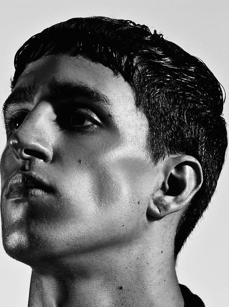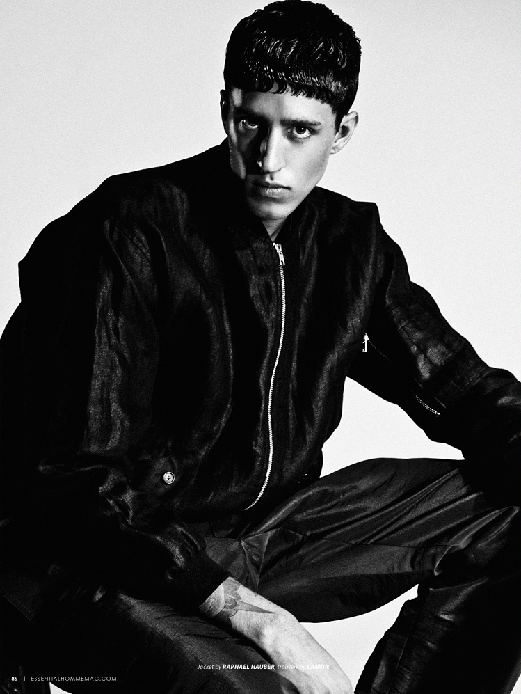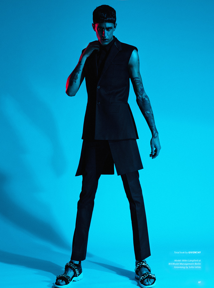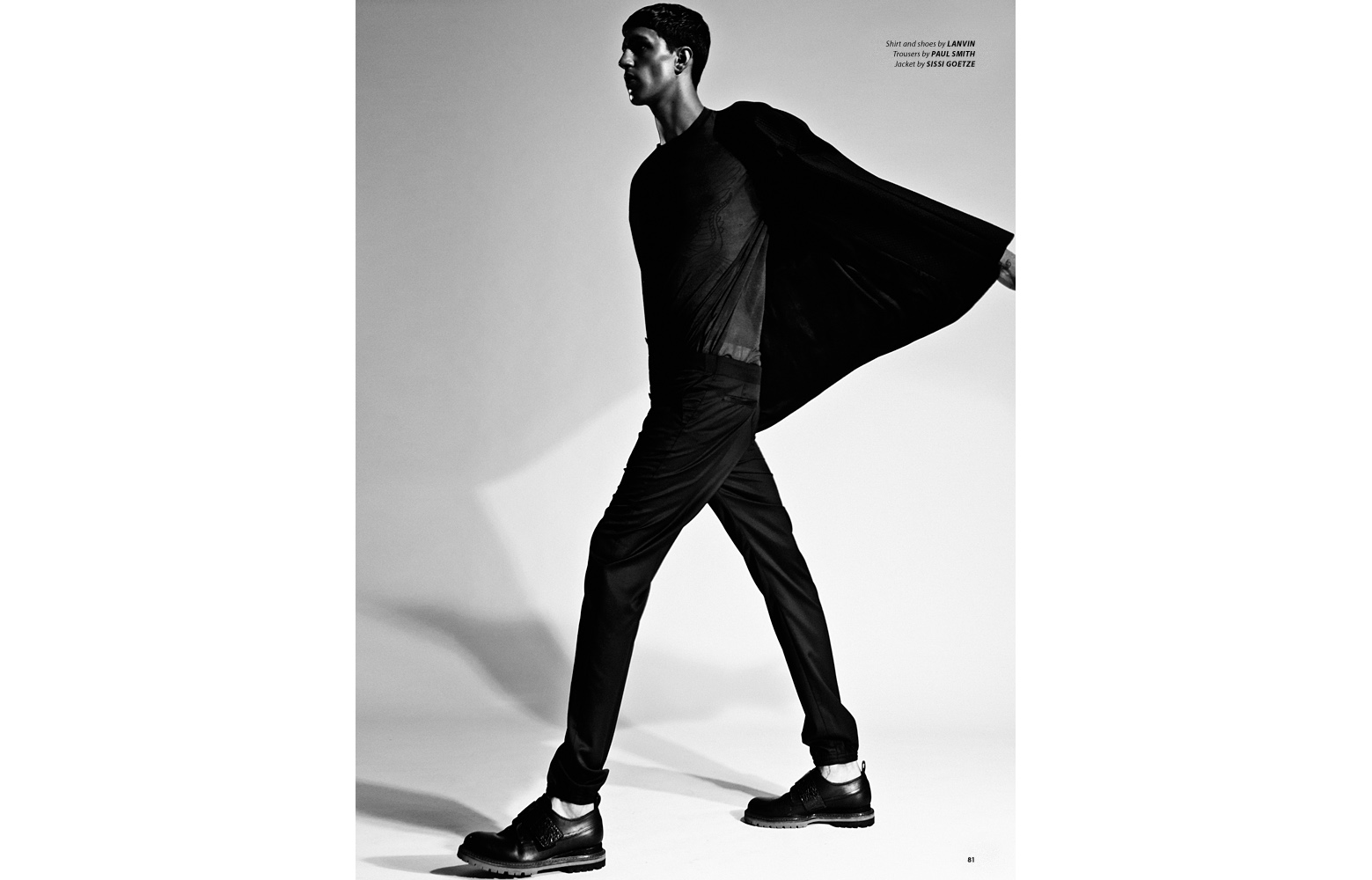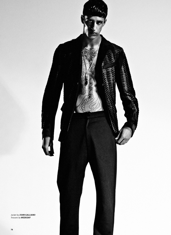Monochromatic–While bold and vibrant colors may lead this season’s fashion trends, one timeless shade never loses its appeal. The color black, which gains traction in this new editorial lensed by Arcin Sagdic appears in the May/June 2013 issue of Essential Homme. Capturing British model Miles Langford wearing bold black numbers, including Givenchy’s sleek silhouettes, John Galliano’s eccentric jackets, Lanvin’s impeccable designs and many more, Sagdic shoots almost dramatic studio images. Emphasizing the connection between a timeless sense of style and an almost futuristic aesthetic, provided by stylist Bodo Ernle, Miles stuns in sophisticated black & white images and in intriguing blue-hued shots. / Grooming by Sofie Uehla.