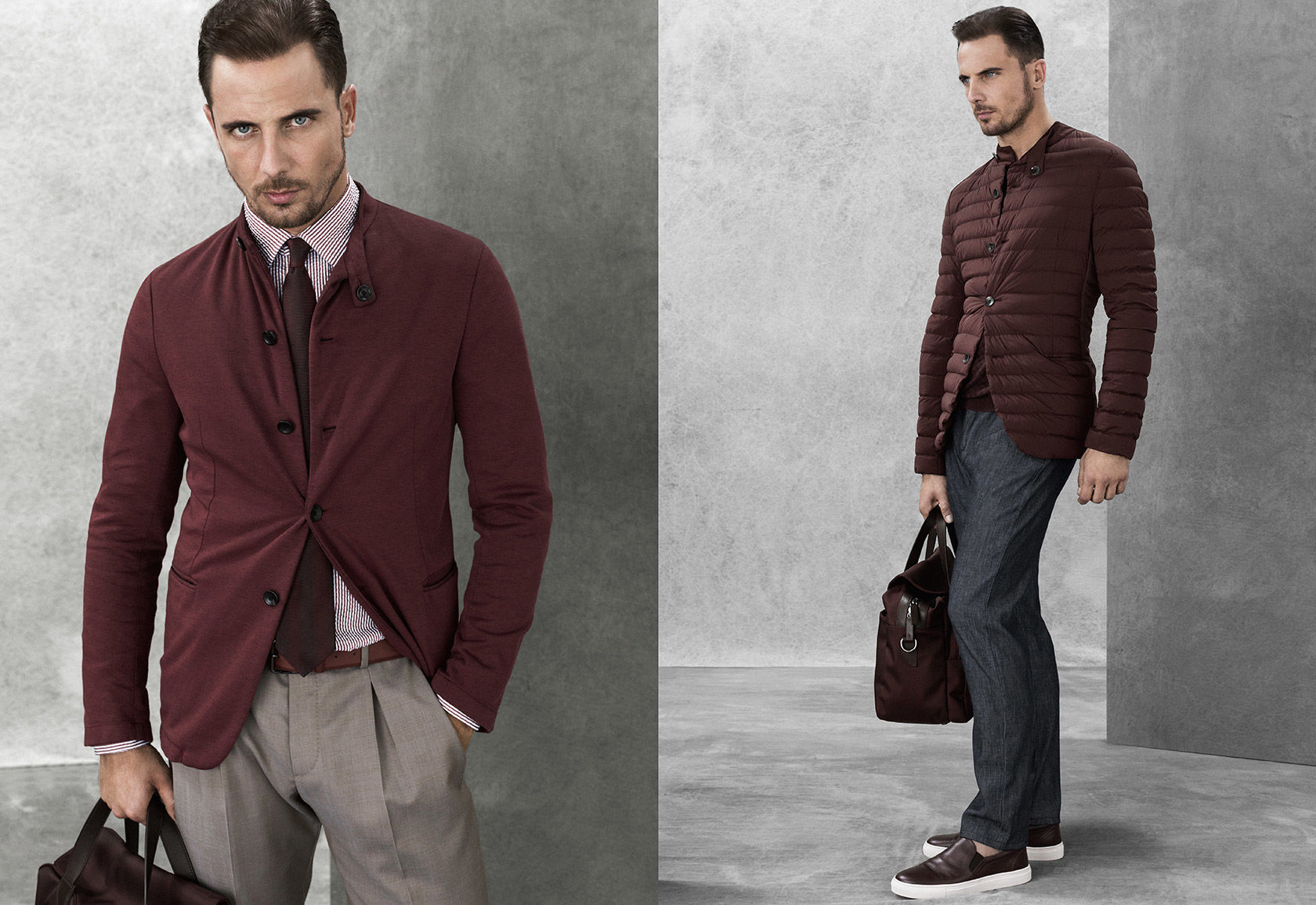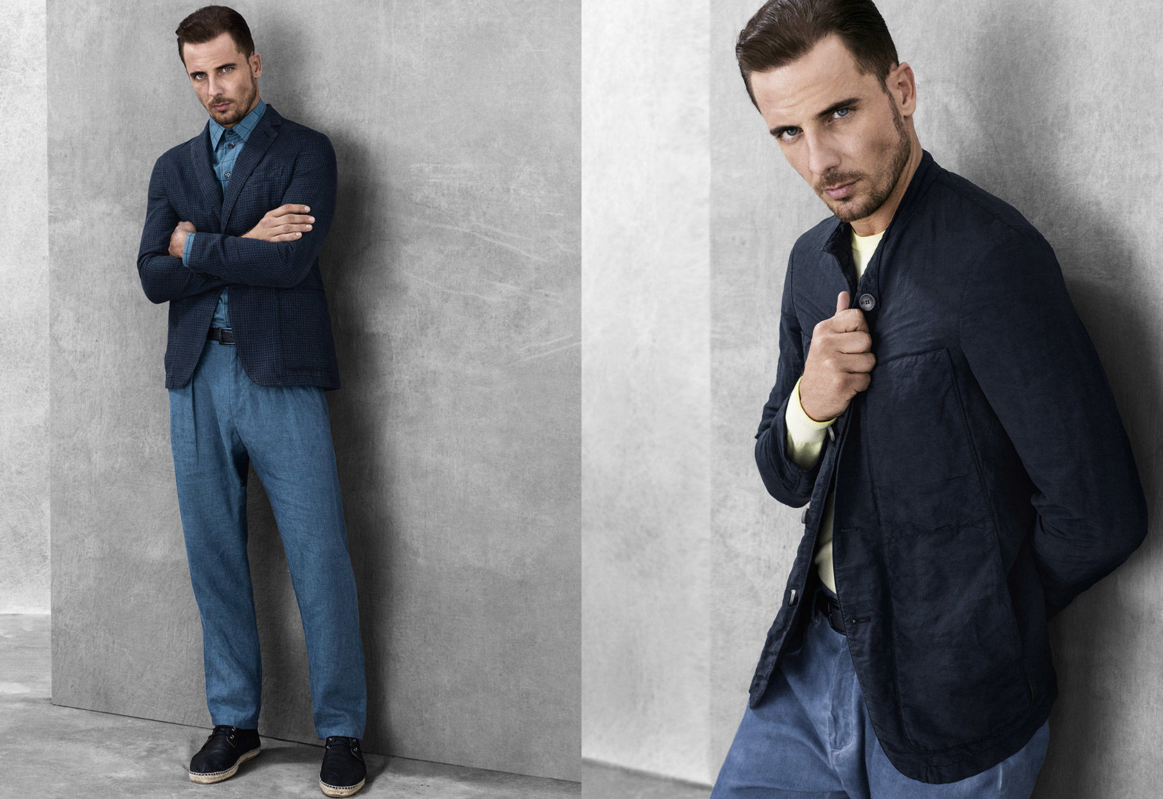 Unveiling its spring-summer 2016 men’s catalogue, Armani Collezioni presents a polished offering. A mix of neutrals, black, grey and navy are juxtaposed with pops of color for a wardrobe that highlights soft tailoring. Slim-fit stretch poplin shirts, printed linen button-downs, cotton blend cardigans, silk sweaters and jersey jackets contribute to the refined outing. Continuing clean, lean lines, slim trousers are furnished in stretch cotton, gabardine and wool. Bringing a casual, confident flair to the range, slip-on sneakers are the perfect choice of footwear for the season.