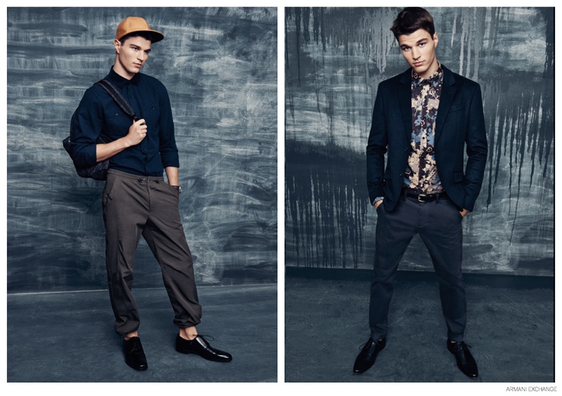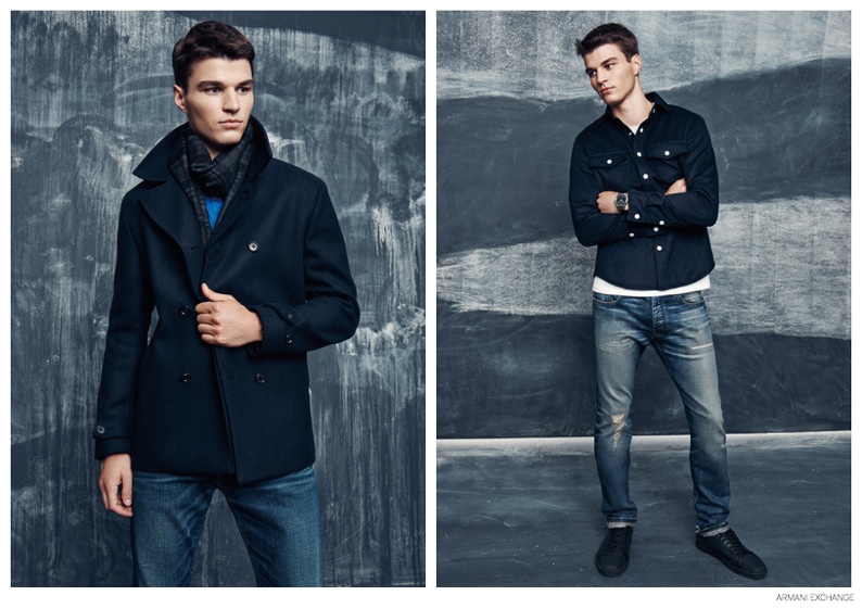 Armani Exchange’s Latest Styles-Model Arran Sly heads to the photo studio, unveiling new looks for Armani Exchange’s October 2014 lookbook. Dressed in navy and charcoal, Arran showcases a sensible style, keeping his wardrobe casual with distressed denim jeans and smart separates. From signature items like the peacoat to the fun abstract print of a dress shirt, Armani Exchange keeps its lineup fresh without forcing a heavy hand.