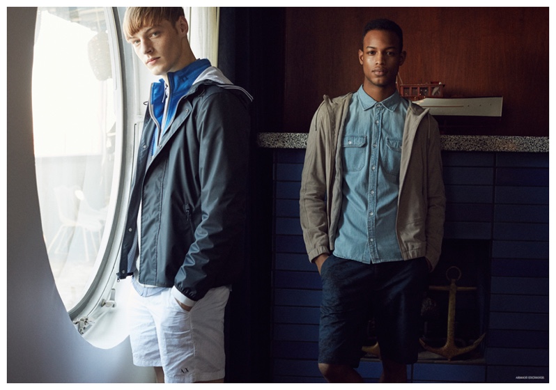 Although Armani Exchange’s spring 2015 campaign featured trendy tropical styles, the latest men’s lookbook from the label is more grounded in basics. Geared towards the transition from the colder months to warmer days, Armani Exchange rounds up a versatile selection of garments. Models Conrad Bromfield and Roberto Sipos star in the lookbook, layering in separates that include windbreakers, denim shirts, twill cotton shorts and casual t-shirts.