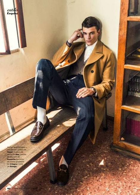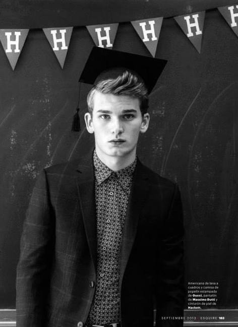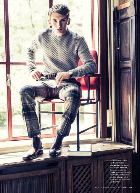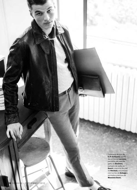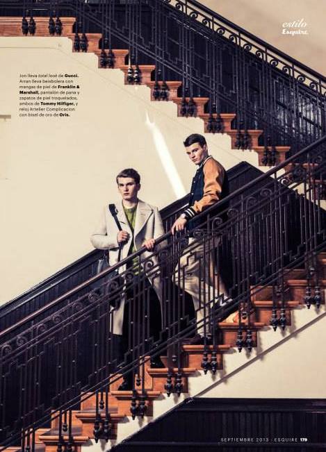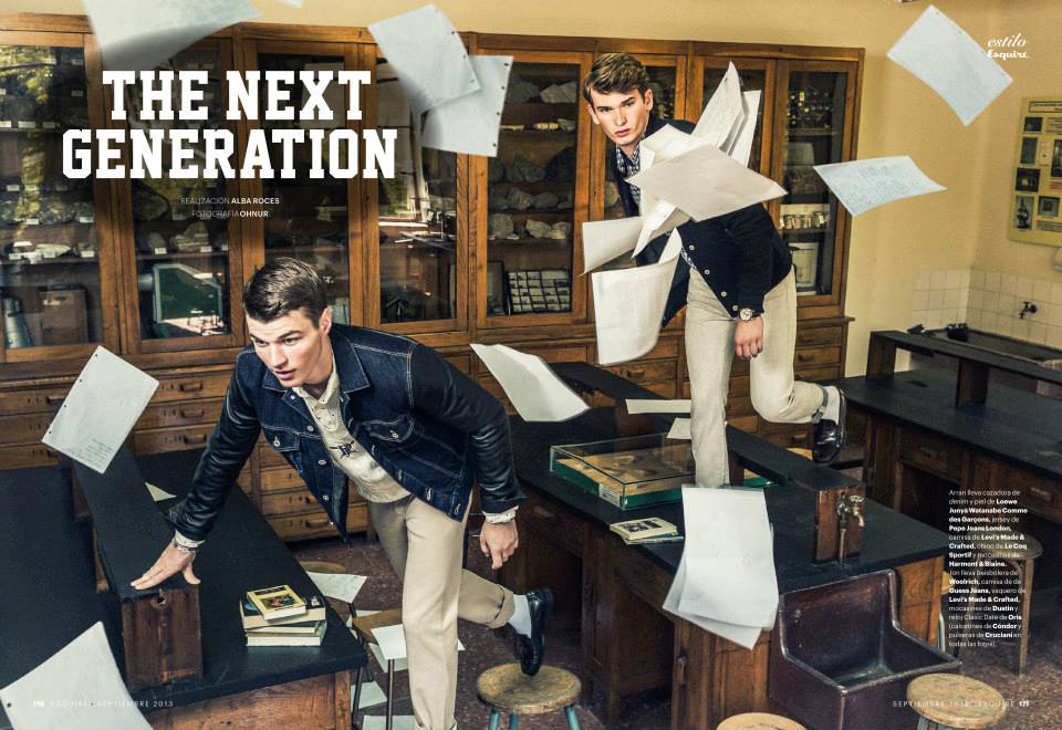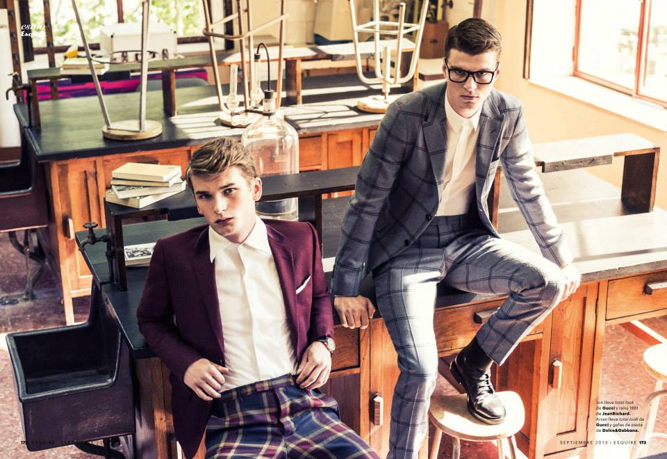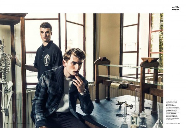 Back to School–Photographer Alfonso Ohnur captures models Arran Sly and Jon Dartnell for the September issue of Spanish Esquire, delivering a fashion story which is styled by Alba Roces. Captured during their return to school, Arran and Jon are ready to spend few months of study wearing a fashionable wardrobe which blends a traditional preppy aesthetic with bold leather jackets, timeless camel coats and quite an inclination for plaid patterns.