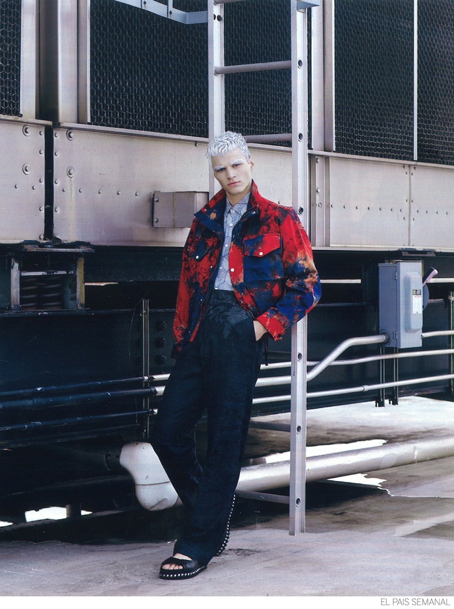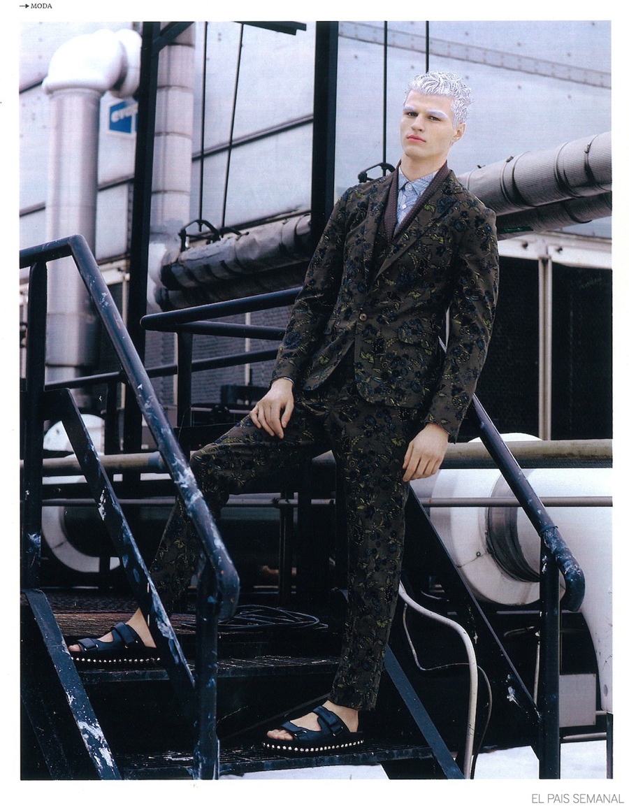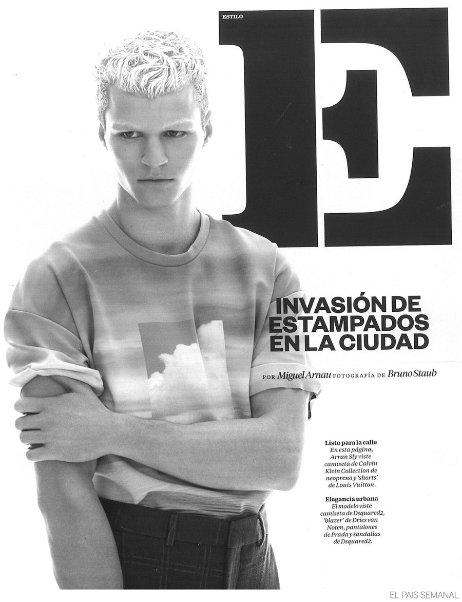 White Hair Moment-After appearing in an editorial for Spanish fashion magazine El País Semanal earlier this year, model Arran Sly returns for a summer story shot by photographer Bruno Staub. The View Management model is a cool and collected personality as he sports white hair and eyebrows. Connecting with Miguel Arnau, Arran wears trendy prints that include Gucci’s floral motif, Calvin Klein’s graphic take on summer and Prada’s dark paradise.