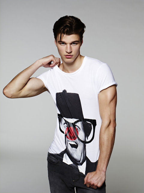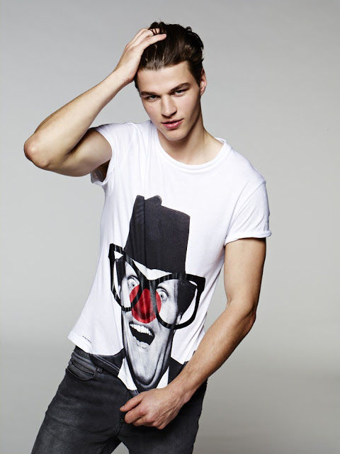 A Good Cause–Donning the limited edition t-shirt exclusively designed by Stella McCartney for Red Nose Day 2013, model Arran Sly appears before the lens of model turned photographer Helena Christensen in a series of pictures, shot to support UK-based charity Comic Relief. Following David Gandy’s footsteps, Arran joins the group of models and celebrities that lend their images to support the charity’s efforts to improve lives in UK and Africa. / Makeup by Lauren Parsons.