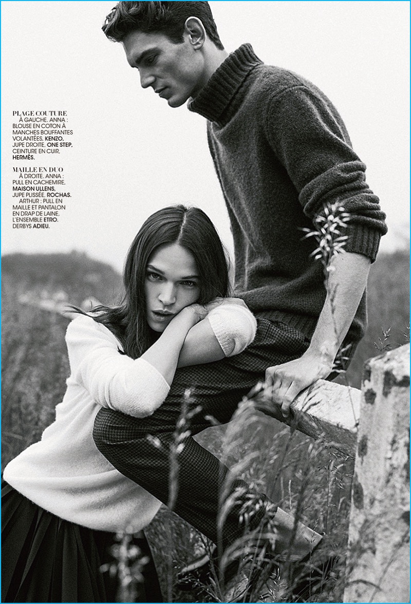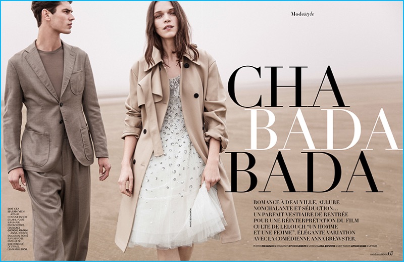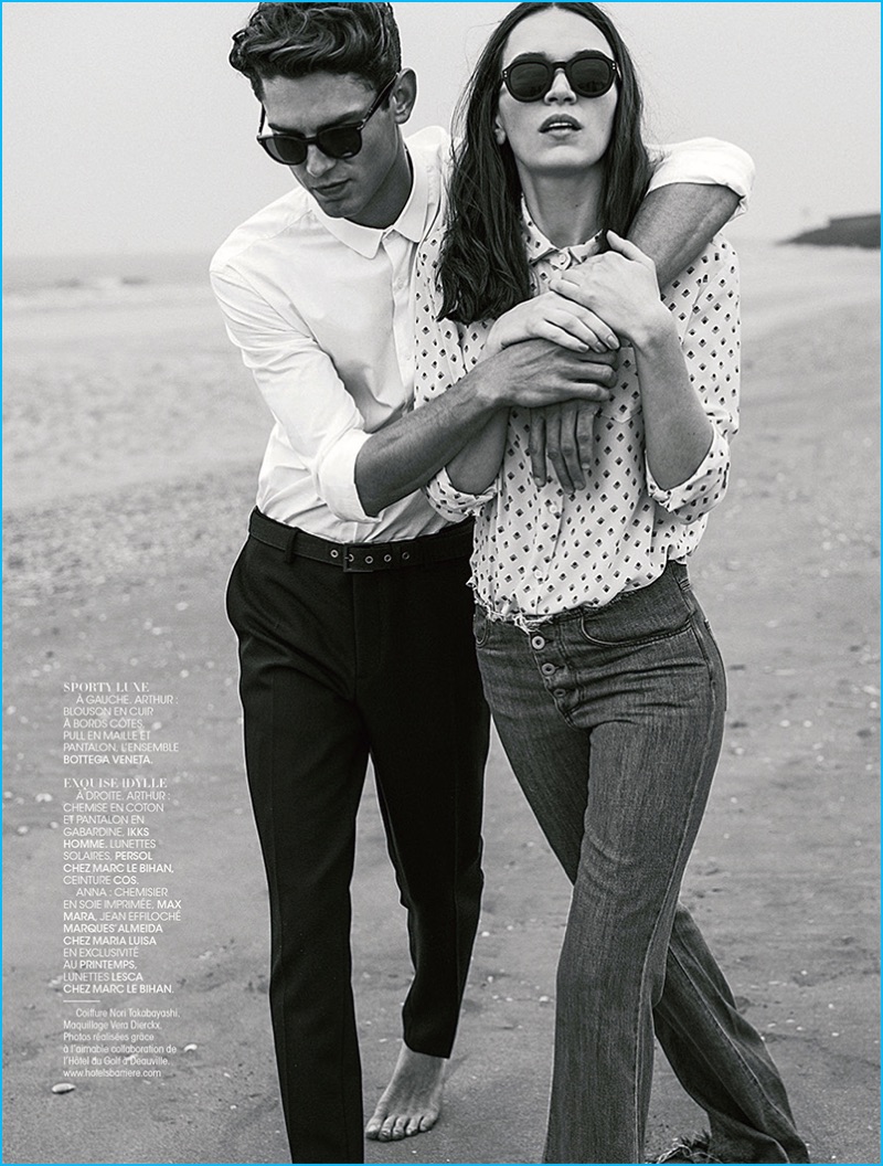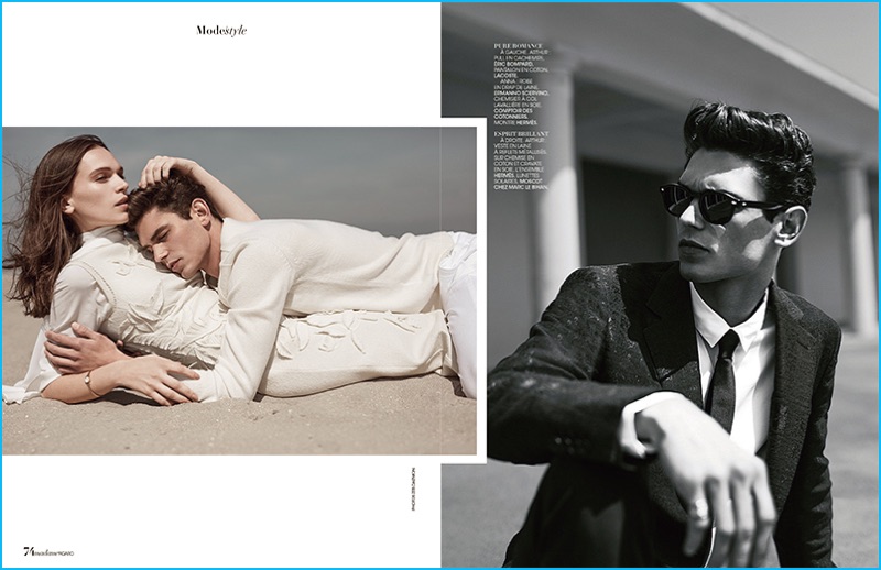 French model Arthur Gosse takes to the beach with English actress and model, Anna Brewster for an editorial in Madame Figaro. Embracing neutrals and sleek designer fashions, Arthur is styled by Sylvie Clemente. The MP Paris model embraces a natural energy, posing for images by photographer Zeb Daemen. Donning tailored suits, cashmere sweaters, and more, Arthur is pictured in brands such as Etro, Giorgio Armani, Paul & Joe, and Paul Smith.