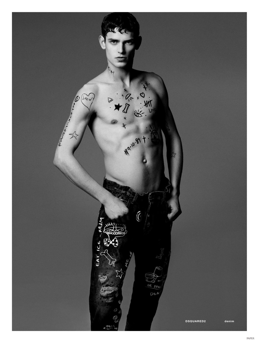 The writings on Arthur Gosse as he wears graffiti denim jeans from Dsquared2. Pin