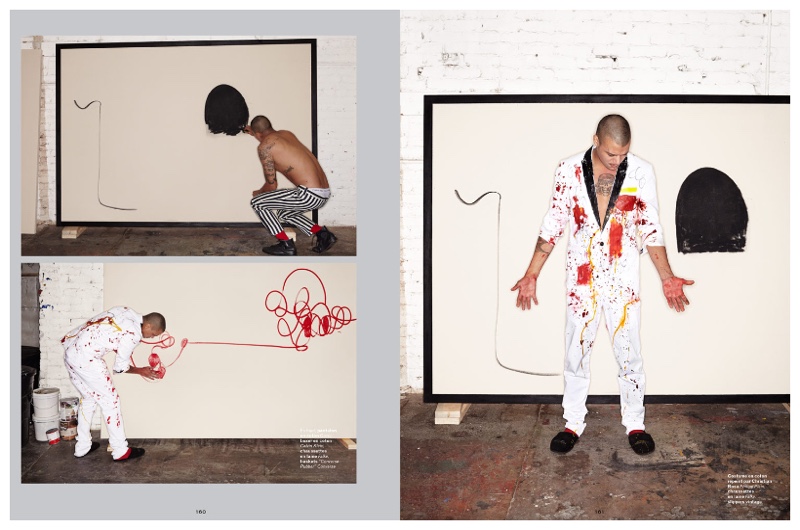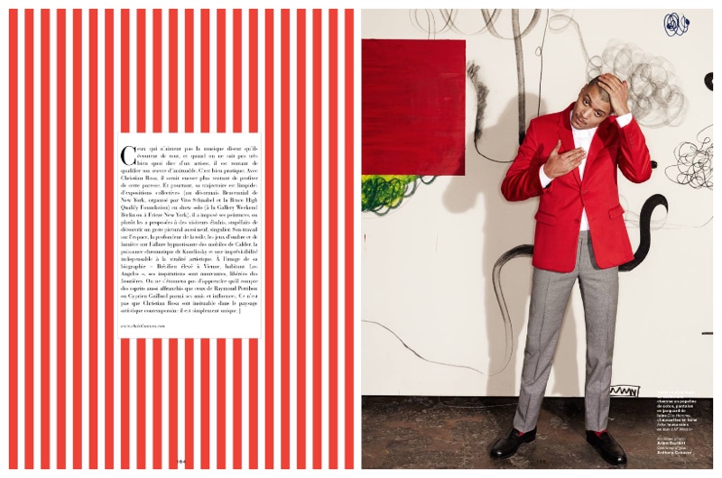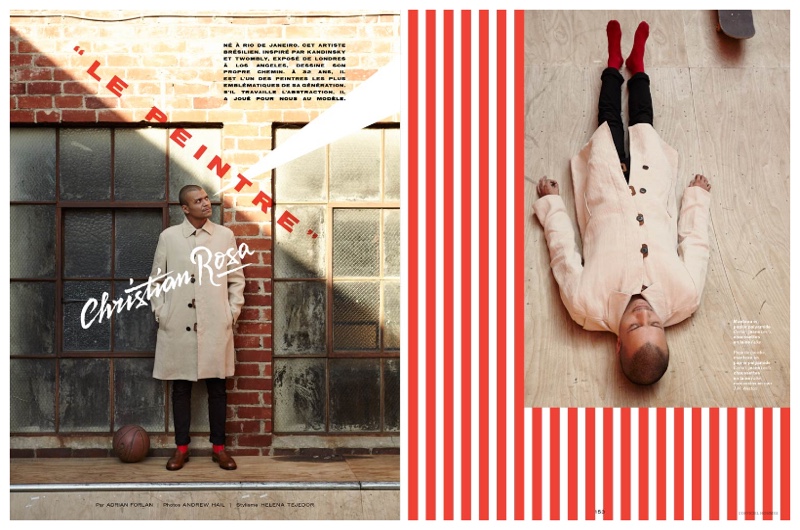 Brazilian artist Christian Rosa graces the pages of the latest edition of L’Officiel Hommes with a shoot lensed by photographer Andrew Hail. The contemporary artist showcases his latest works as he poses for quirky images for the magazine. Outfitted by stylist Helena Tejedor, Rosa dons a mix of current and vintage pieces with a graphic appeal.