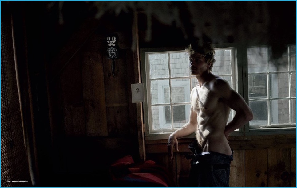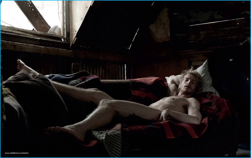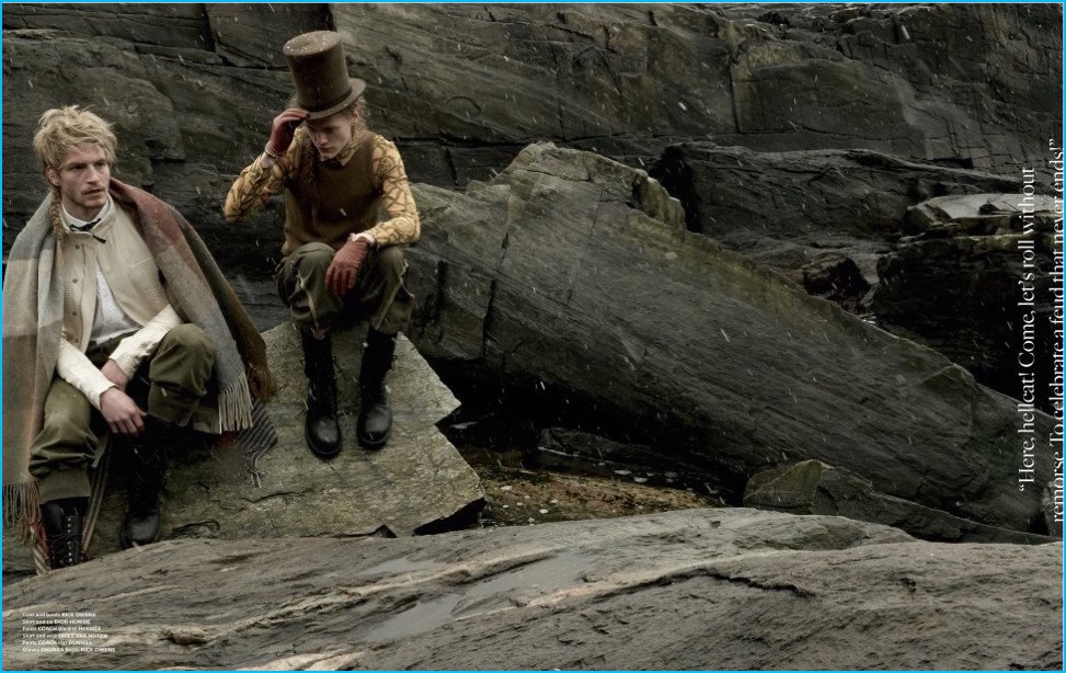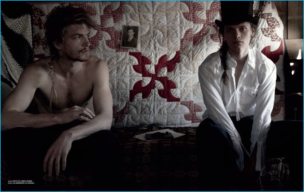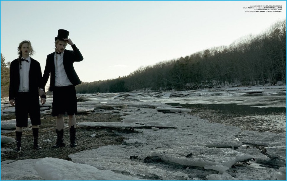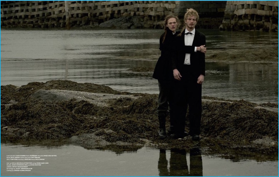 Approaching its most recent issue, At Large looks to the 1977 Ridley Scott directed film The Duellists for inspiration. Taking the movie’s strong imagery and running with it, photographer Carter Smith and stylist Paul Sinclaire collaborated on a fashion editorial. Embracing a cinematic flair for the occasion, models Jesse Shannon and Ryan Keating are thrust into the spotlight, wearing tailored fashions from brands such as Saint Laurent and Gucci.