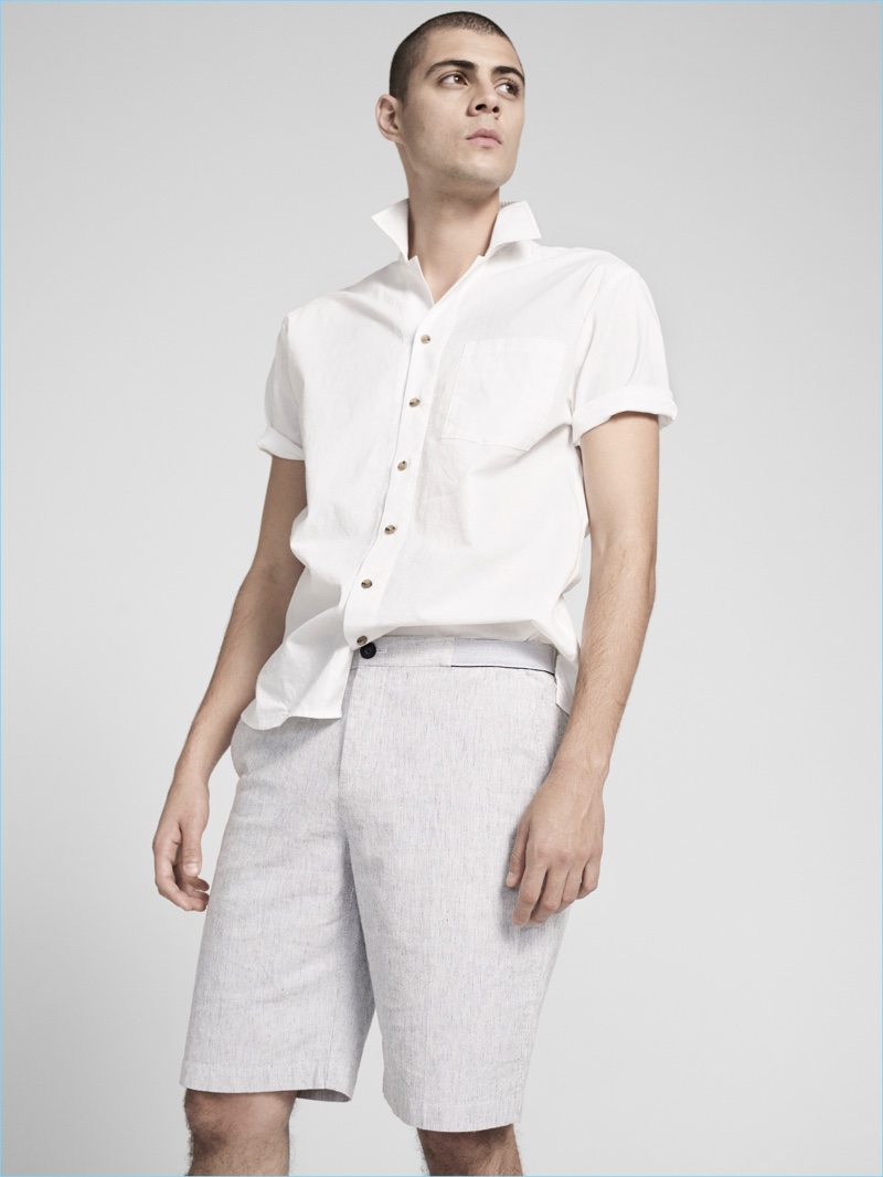 PinMicky Ayoub turns his collar up as he sports a short-sleeve shirt and tailored shorts from ATM’s pre-fall 2016 men’s collection.