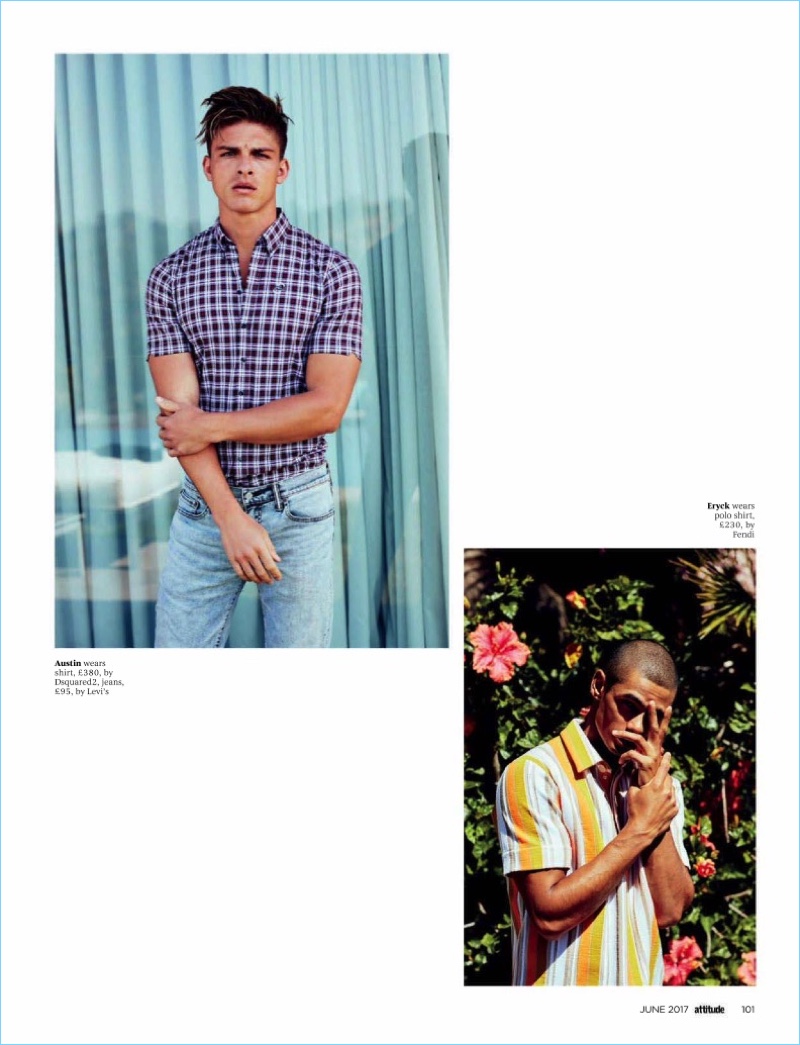 Summer is in full swing as models Eryck Laframboise and Austin Victoria come together for an Attitude editorial. They grace the pages of the magazine’s June 2017 issue. Taking to sunny California, the models appear before photographer Leigh Keily. Austin and Eryck showcase relaxed styles from a myriad of labels. Here, stylist Joseph Kocharian pulls together brands like Diesel, Adidas, and Moschino.