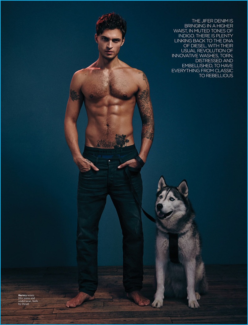 Attitude magazine explores Diesel’s latest denim styles for an editorial in its December 2016 issue. Joseph Kocharian outfits models Harvey Haydon (Next Models) and Rae (Brother Models) for the casual fashion spread. Photographer Jenny Brough also captures Harvey and his Husky, Xavier. Circling back around to denim, Attitude introduces us to Diesel’s new styles, the Jifer and the Thommer. The distressed models contribute to the brand’s Jogg and Royal Indigo collections.