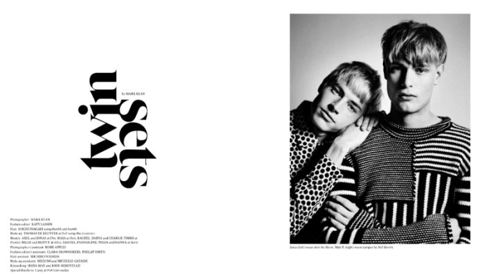 Winning Pairs–Axel Gillot, Charlie Timms, Matt P., Sascha Bailey and Jonas are recruited for a chic new story in the most recent edition of Sleek magazine. Dressed in a fun print-fueled wardrobe of Paul Smith, Marni, Prada and other labels, the pairs are outfitted by Katy Lassen with photography by Mark Kean.