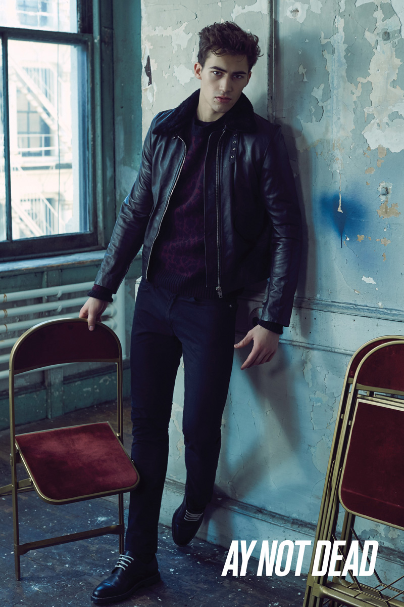 Argentinean fashion brand AY Not Dead taps Italian model Alessio Pozzi to front its fall-winter 2016 campaign. Photographer Sebastian Faena reunites with the label, collaborating with stylist Sofia Achaval. Posing for dark images against a drab background, Alessio sports contemporary staples from the brand. Alessio’s wardrobe includes a range of separates, including leather moto jackets, slim-cut denim jeans, trim suiting and bomber jackets. Offering a more detailed look at the collection, Alessio heads to the studio with photographer Gonzalo Romero and stylist David Pollak.