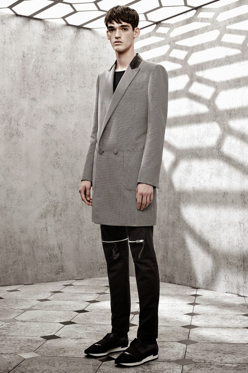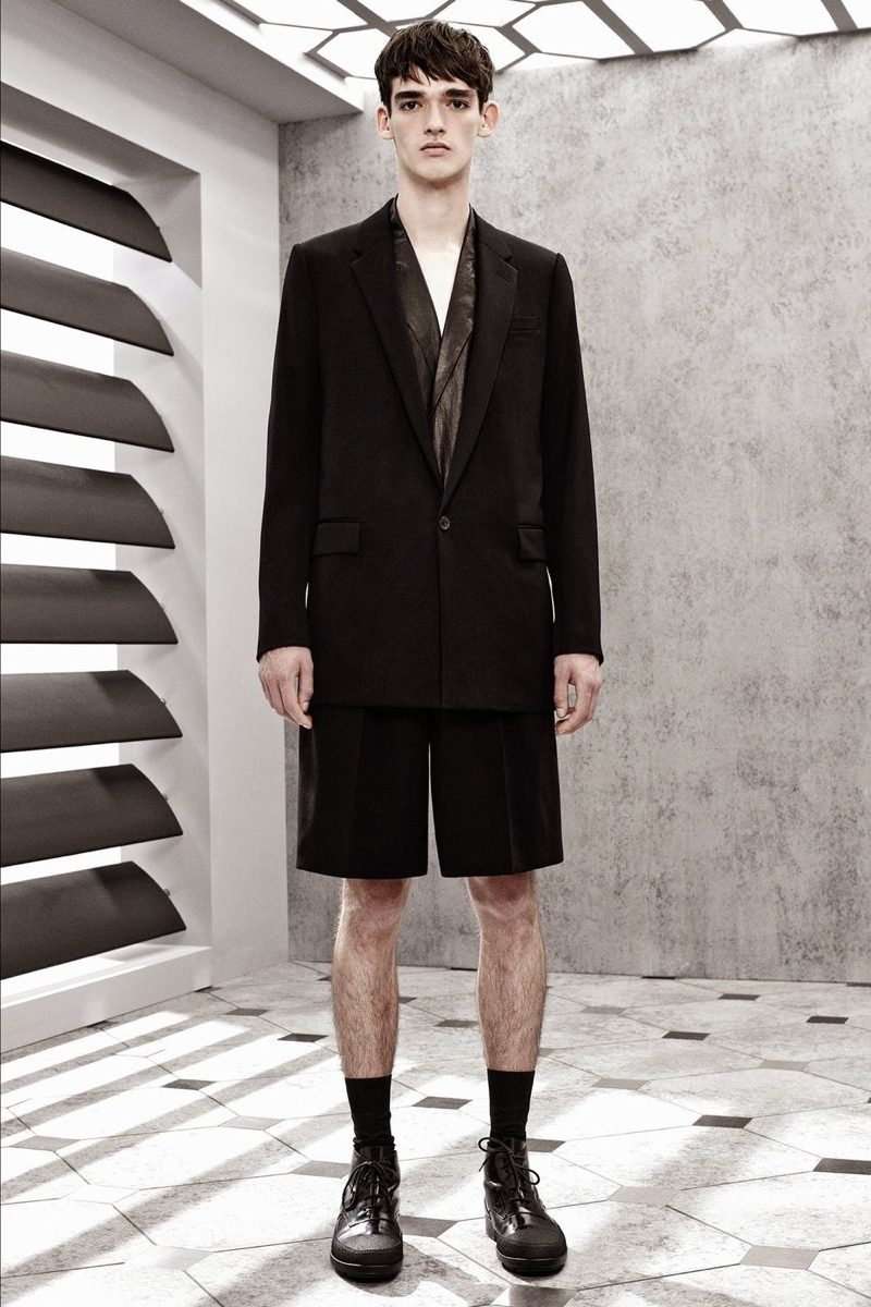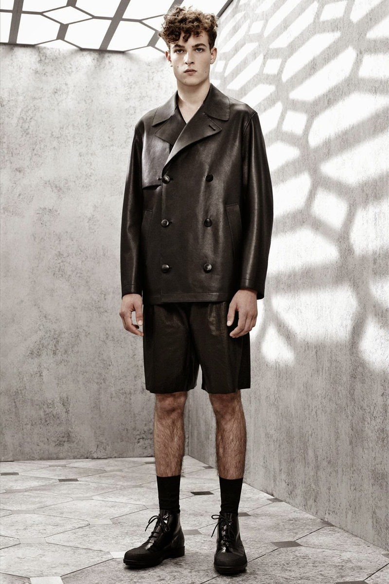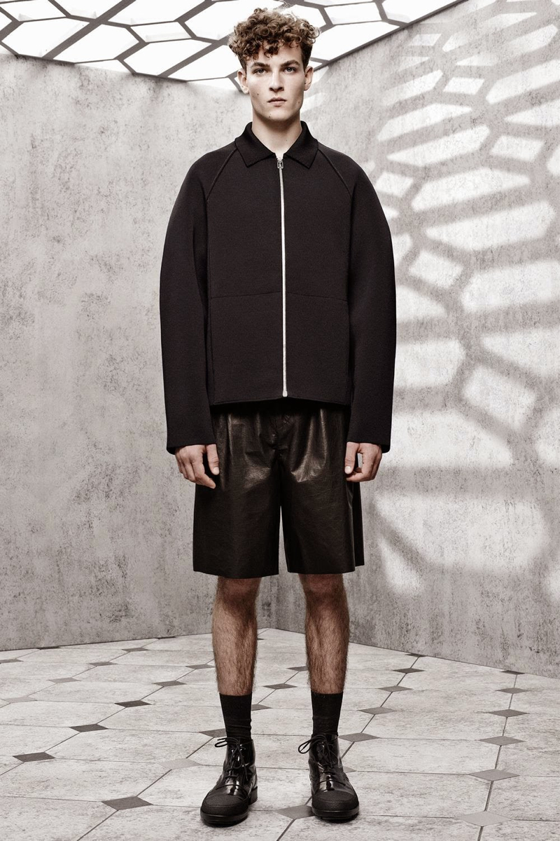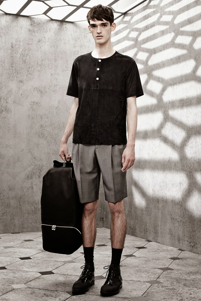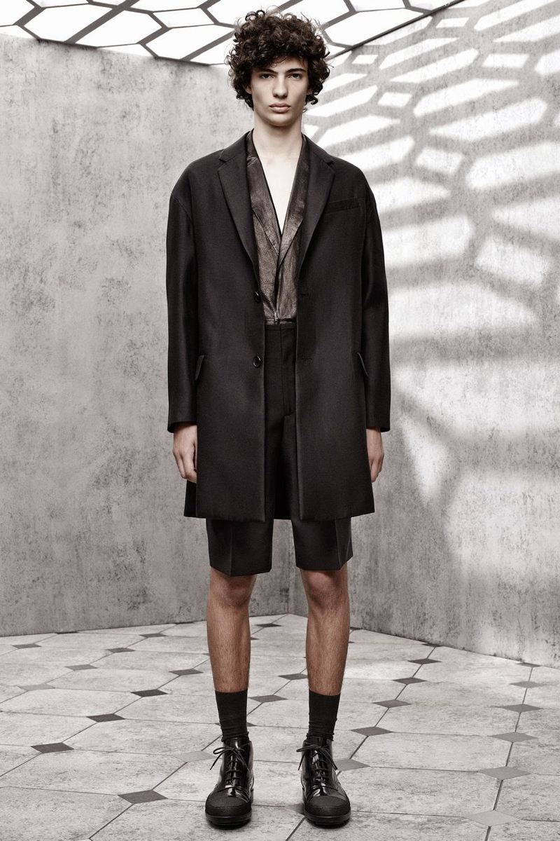 Balenciaga-Men-2015-Spring-Summer-Collection-011PinBalenciaga Spring/Summer 2015–The latest collection from Balenciaga is sharp, concise and to the point. Featuring an understated color palette of black, gray and blue hues, the collection is minimal on the details, highlighting menswear classics like the trench with a concealed closure and a small collar. The same quiet philosophy translates into short-sleeve knits built on structure as well as longer jackets. Adding leather to the mix, the shape is more relaxed for a double-breasted jacket with matching shorts. The heart of the collection, the utilization of luxe fabrics to reinterpret items as simple as the long-sleeve tee and henley are an achievement.