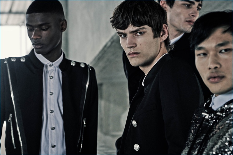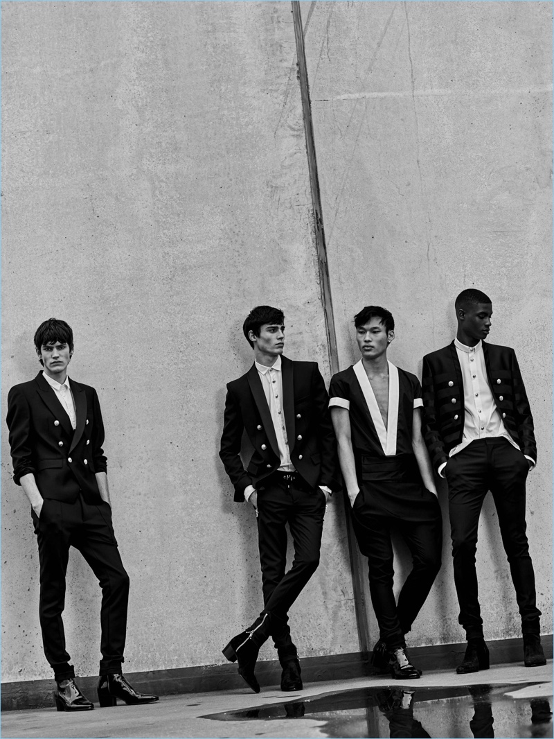 Rachide Embalo, Elias de Poot, Chun Soot, and Oussama Guessoum wear tropical looks with a black spin from Balmain.Pin