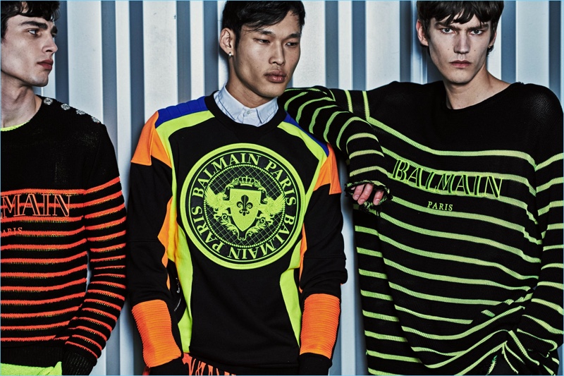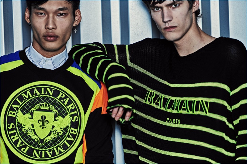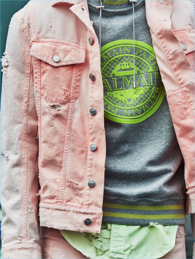 Balmain delivers colorful sweatshirts and denim fashions for resort 2019. Here, Elias de Poot and Oussama Guessoum wear standout looks.