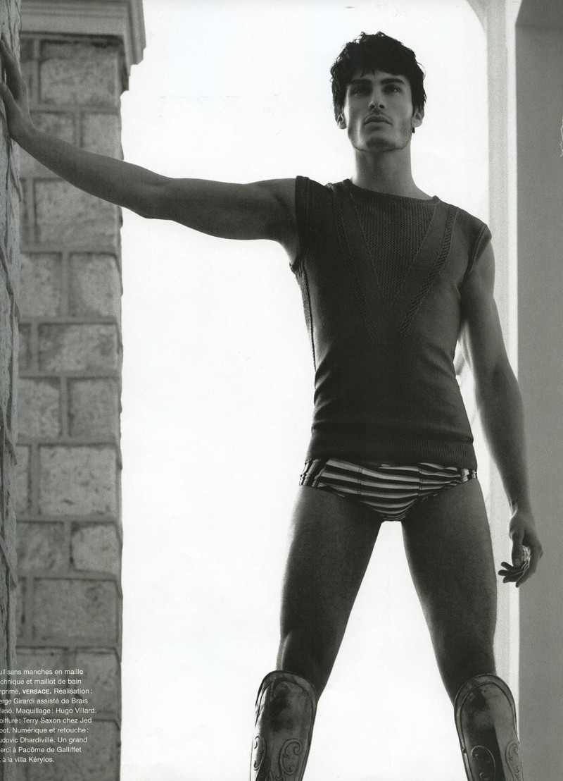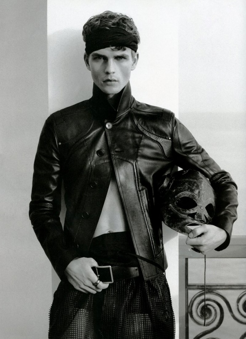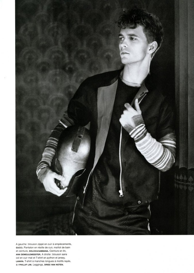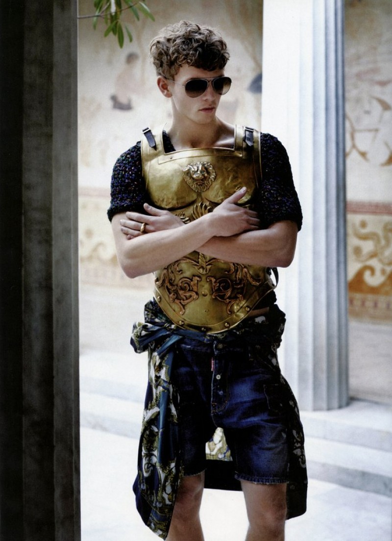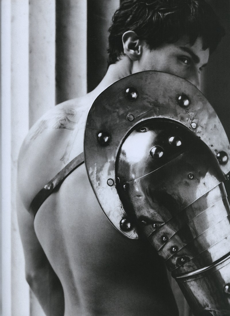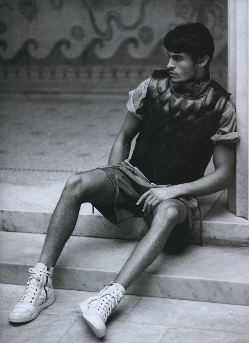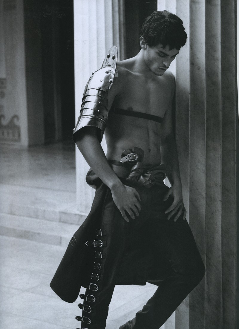 Karl’s Army-Models Baptiste Giabiconi and Benjamin Eidem play the roles of modern gladiators for the latest story lensed by fashion icon Karl Lagerfeld for the spring/summer issue of French magazine Numéro Homme. Outfitted by Serge Girardi for an ancient Rome inspired editorial, the pair sport an eclectic wardrobe that includes bold leather pieces, lush sweaters and geometric patterns, combined with fierce armors. / Hair by Terry Saxon. Makeup by Hugo Villard.