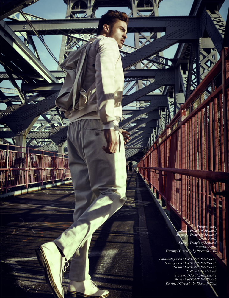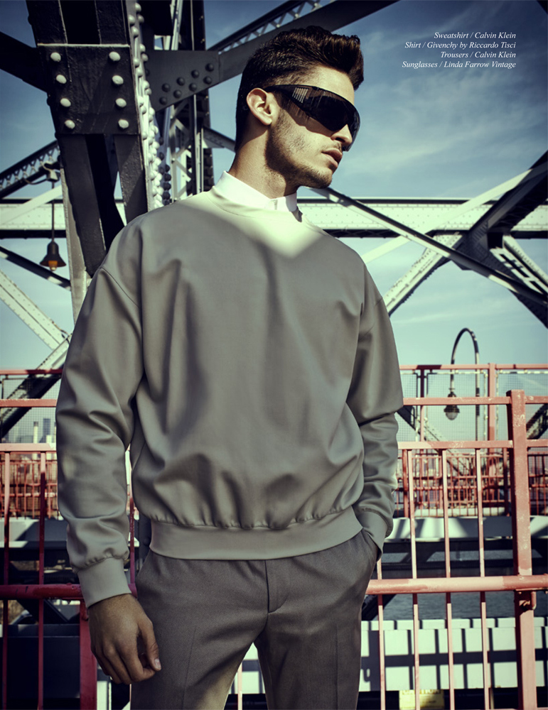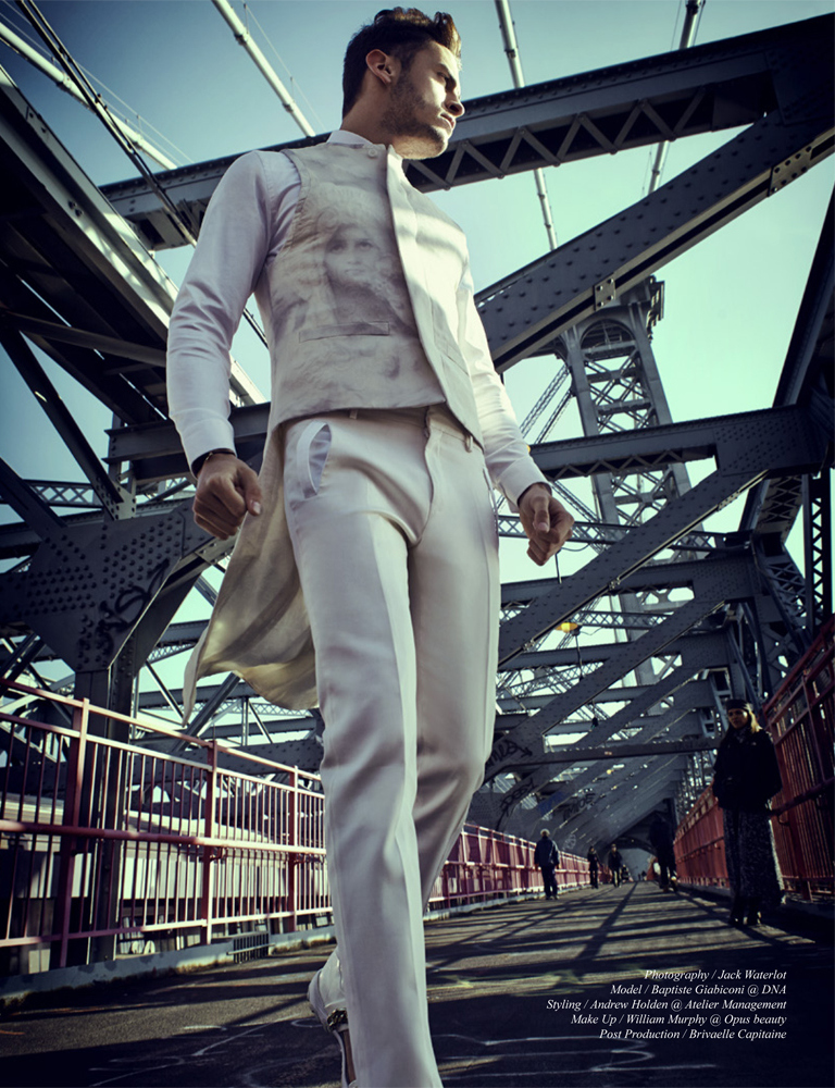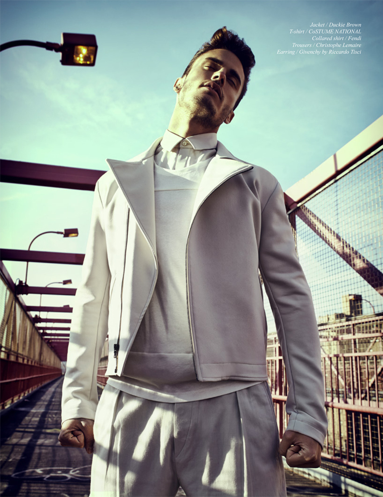 Metropolis–French model Baptiste Giabiconi sports an array of urban looks for the latest issue of Schön!, appearing before the lens of Jack Waterlot. Posing for outdoor images, staged in an architectural and industrial setting, Baptiste models pieces from the likes of Fendi, Givenchy and Calvin Klein, unveiling clean silhouettes that have in common a minimal sense of style, with no frills and essential colors, like black and white, as styled by Andrew Holden (Atelier Management). / Makeup by William Murphy.