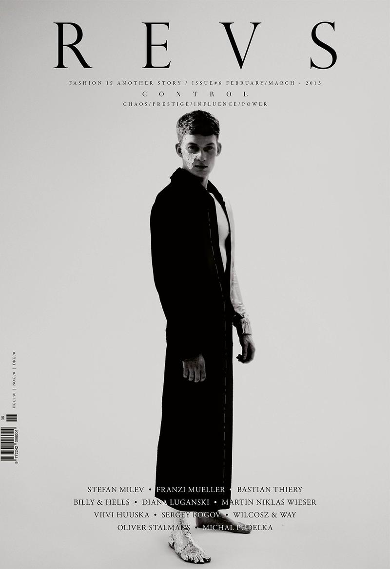 Achromatic Moment–Nest model Bastian Thiery appears before Stefan Milev’s lens for the February/March 2013 cover of REVS magazine. Posing for a black & white stunning studio image, Bastian is a vision of charming mystery in a black ensemble, illuminated by precious golden fine leaves that decorate his feet and part of his dashing face.