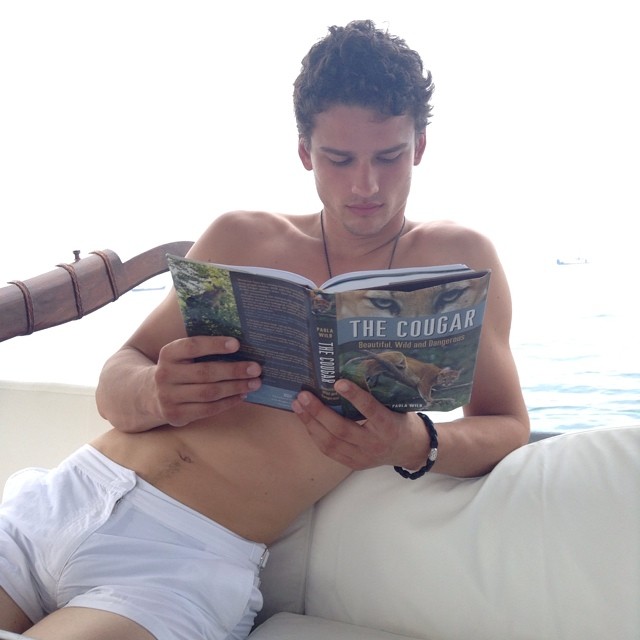 Simon in Bali–Leave it to fashion photographer Sebastian Faena to keep us in the loop. If you follow his Instagram, you would know that he is in Bali currently. Faena’s latest shoot brings him into contact with Canadian model Simon Nessman and model slash it girl of the moment Cara Delevingne. Sharing a look behind the scenes, Cara snaps an image of a studious Simon reading a book about cougars.