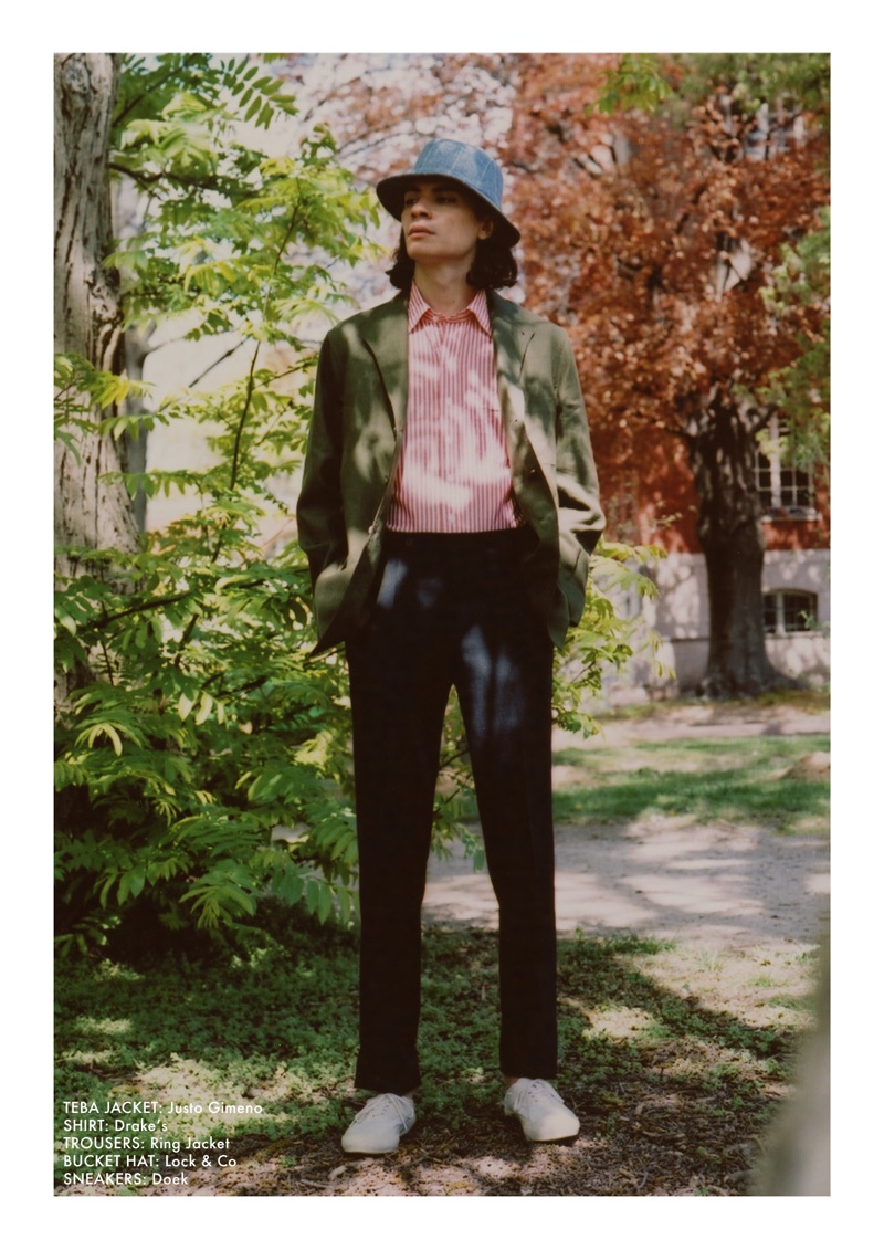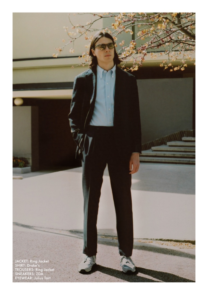 PinCoco Roussel wears a Cohérence overcoat, Drake’s jacket, John Smedley polo, Ring Jacket trousers, and Doek sneakers.