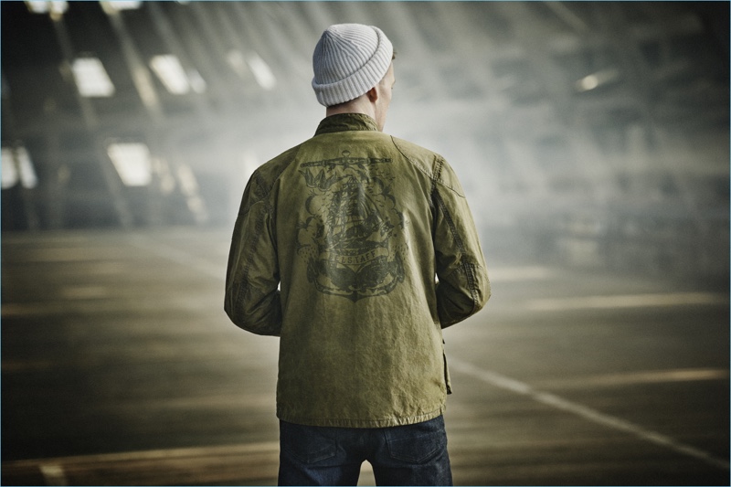 Ninous continues, “This sense of temporary escapism is reflected in edgier elements such as naval tattoo designs and the Jolly Roger flag, giving a sense of rebellion and individuality.” Mirroring the harsh conditions of life at sea, Belstaff’s collection embraces vintage wax treatments and a naval color palette of brown, blue, and military green.