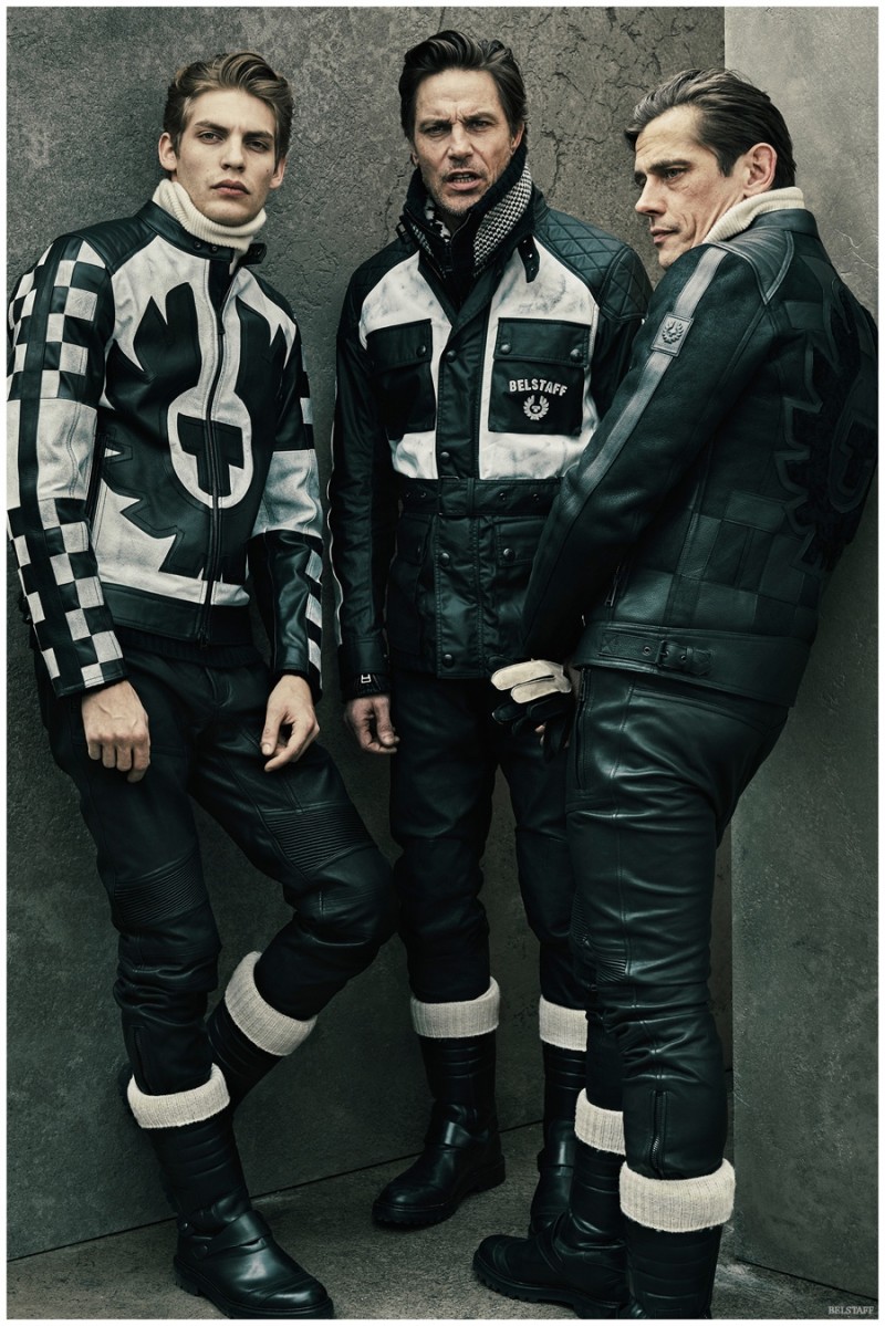 Legendary models Andre Van Noord and Werner Schreyer are joined by Baptiste Radufe for Belstaff’s fall-winter 2015 menswear lookbook. The vice president of men’s design, Fred Dyhr, elevates the label’s biker heritage with a sophisticated outing that bridges the gap between rugged styles for the road and fashions with an everyday finesse. Among a lineup of strong leather jackets, accented by this season’s emerging shearling trend is a collection of phenomenal knitwear in rich, earthy hues. A nod to its storied history, leather pants and jumpsuits balance out the collection.