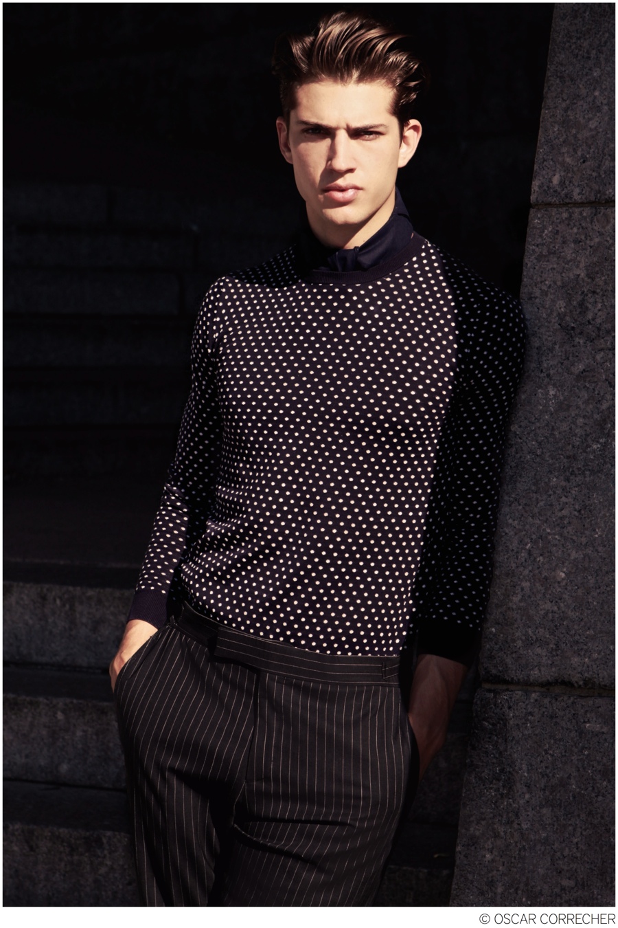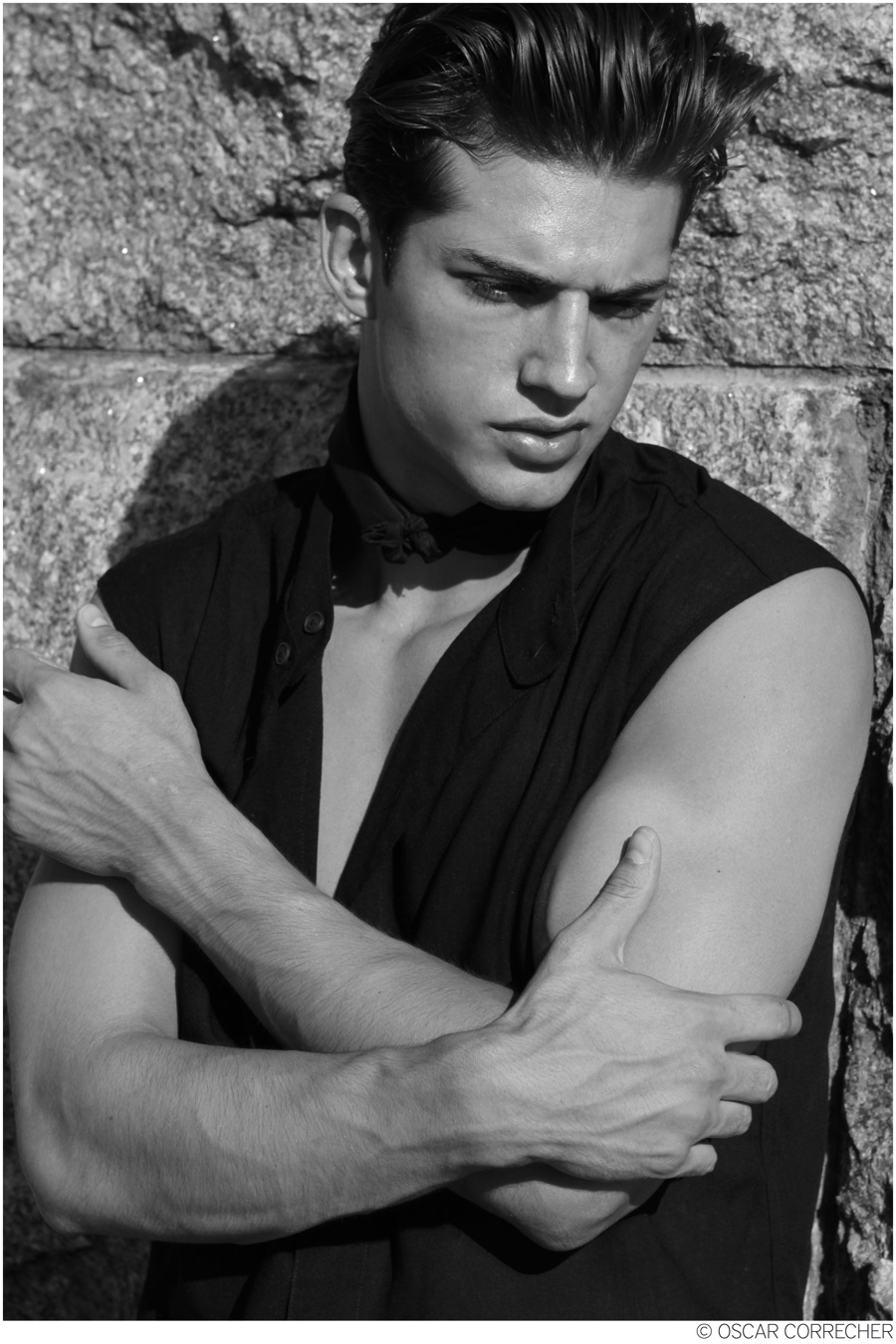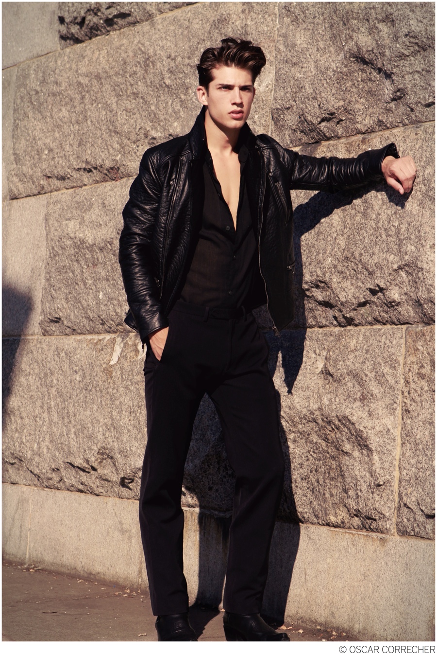 Picture PerfectBen Bowers (New York Model Management) plays muse for the day as he connects with photographer Oscar Correcher for a new shoot outdoors. Captured amongst dancing shadows, Ben is a striking vision as he provides a stern image of masculinity, aided by smart, sleek styling by Donavan Powell.