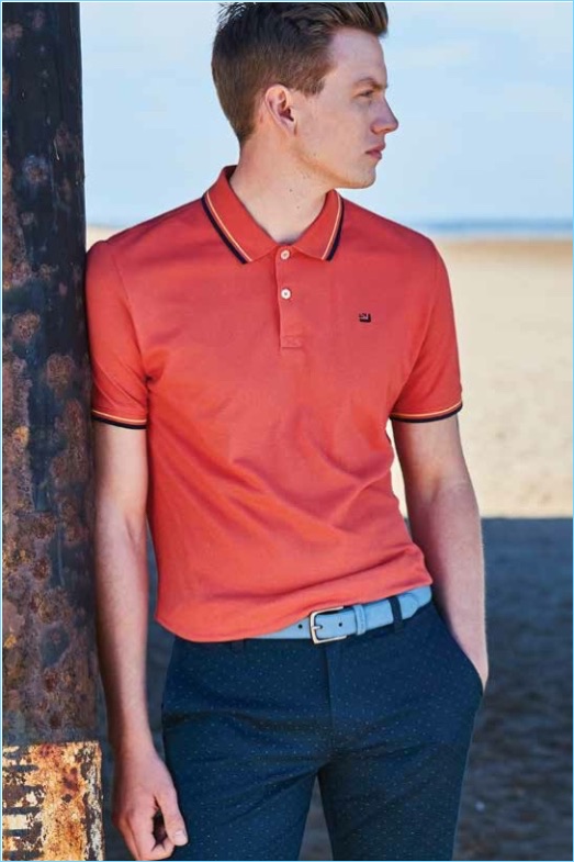 Model Sid Ellisdon sports a long-sleeve polo with dark wash jeans by Ben Sherman.Pin