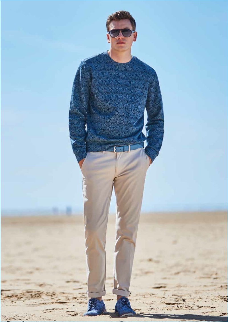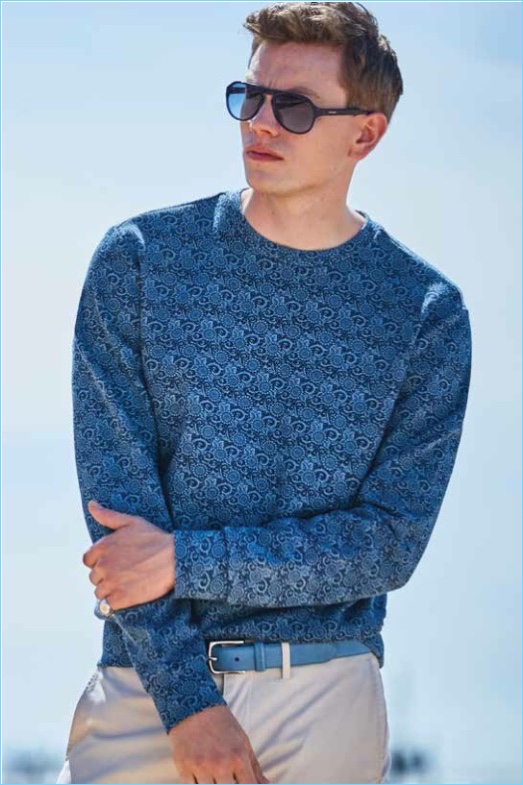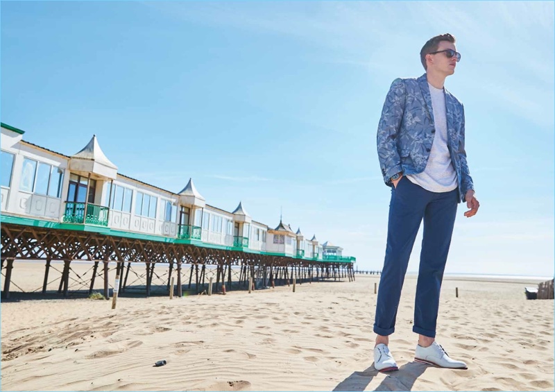 Ben Sherman looks to the Bohemian and psychedelic movements of the 1960s for style inspiration. The label entitles its spring-summer 2018 collection “Peacock Revolution.” Model Sid Ellisdon sports must-haves from the range. They include a seamless transition from spring to summer. Sid wears style standouts such as printed shirts, deconstructed blazers, rolled shorts, and polos. The collection’s color palette inspires with hues of indigo, brick, and pineapple.