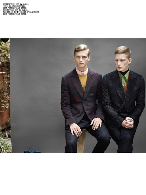Suit Du Jour–Nest men Benjamin Eidem and Bastian Thiery mix and match colors and graphics for 10 Men’s latest editorial spread. Under the help and direction of photographer Paul Wetherell and stylist Mattias Karlsson, the pair go beyond the classic black menswear staple, exploring clashing colors, intricate patterns, and multiple layering. Donning sophisticated suits with a quirky, contemporary twist, Benjamin and Bastian reveal the new rules of sharp dress in chic labels such as Prada, Gucci, and Bottega Veneta. / Hair by Matt Mulhall. Make Up by Kirstin Piggott.