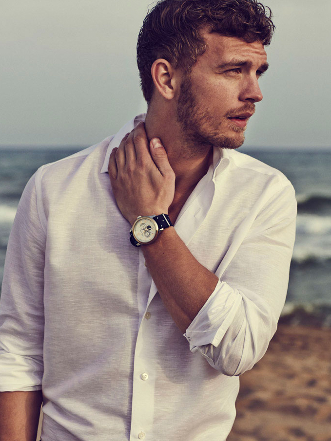 Benjamin Eidem hits the beach in a classic white shirt.Pin