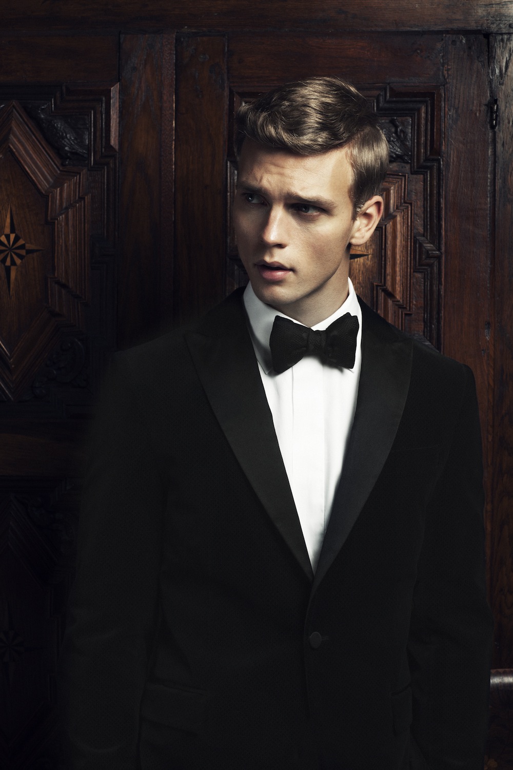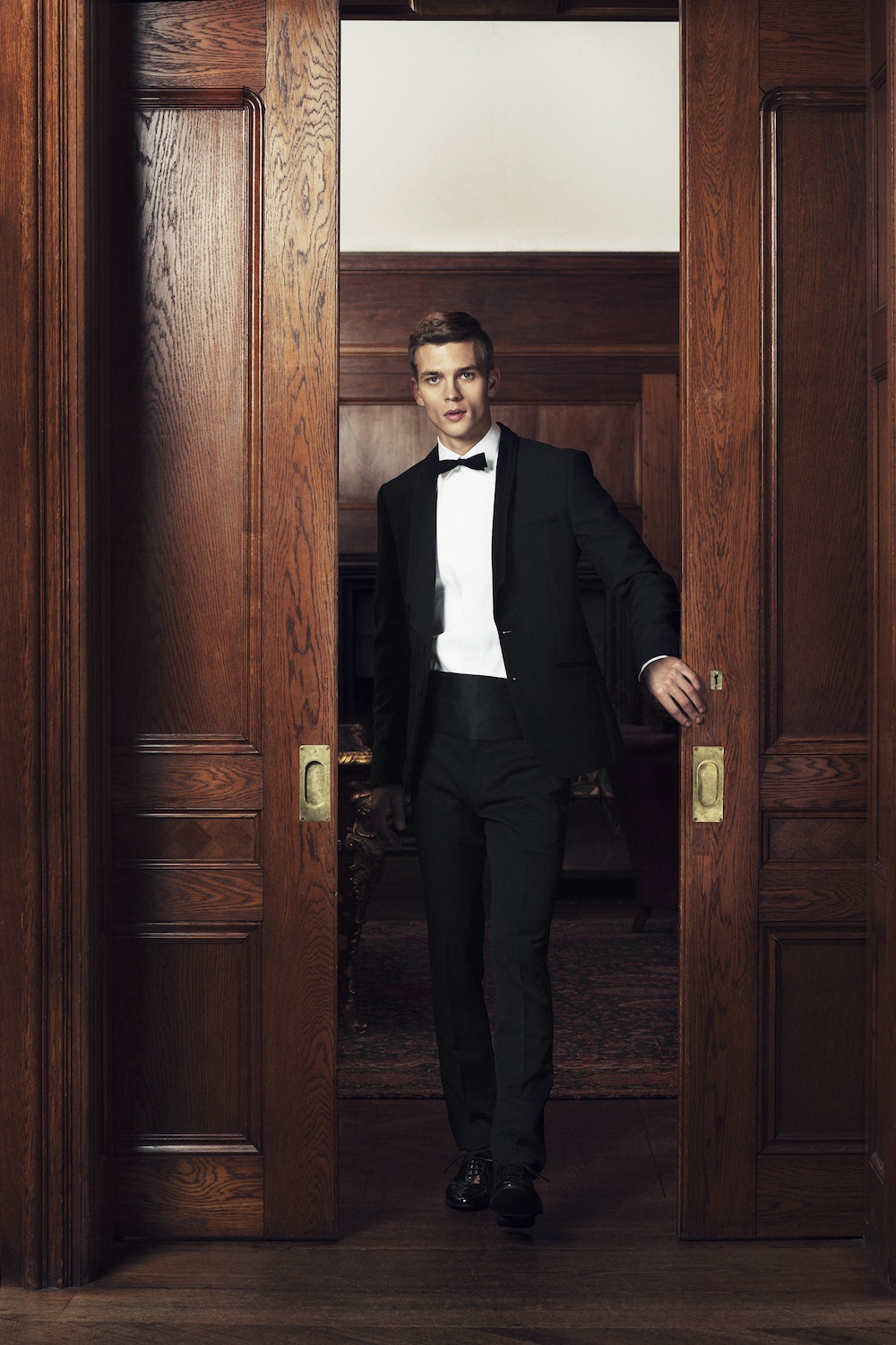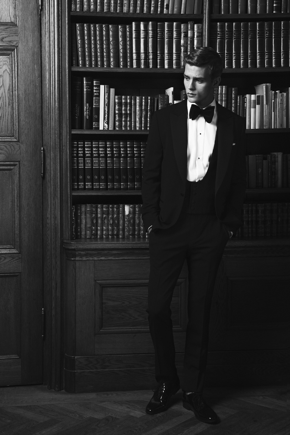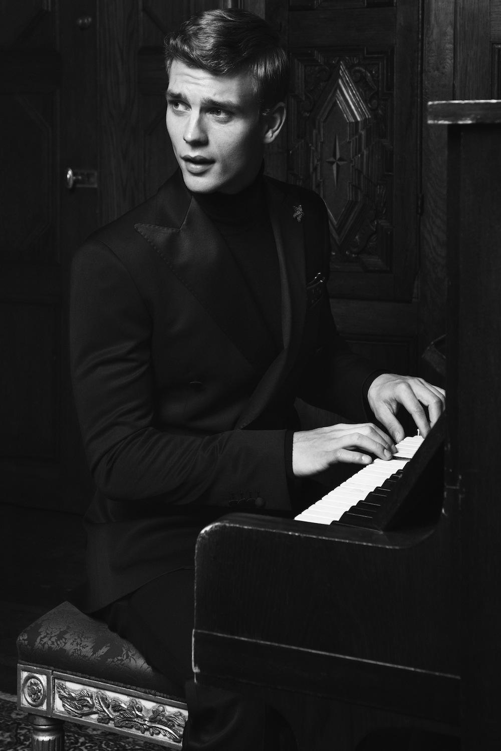Elegantly Dressed–Model Benjamin Eidem graces the pages of Swedish publication King, appearing before the lens of photographer Sara Bille. Playing the role of the old-fashioned gentleman, Benjamin is a stylish presence in an empty wooden setting. Surrounded by countless books and a piano, the Elite London model is styled by Iris Hjelmstedt in a series of glamorous eveningwear styles. From classic black tuxedos, to luxurious dinner jackets in burgundy velvet, Benjamin strikes the perfect poses, sipping a glass of whisky or singing a song playing the piano. / Grooming by Veronica Lindqvist (Mikas Looks).