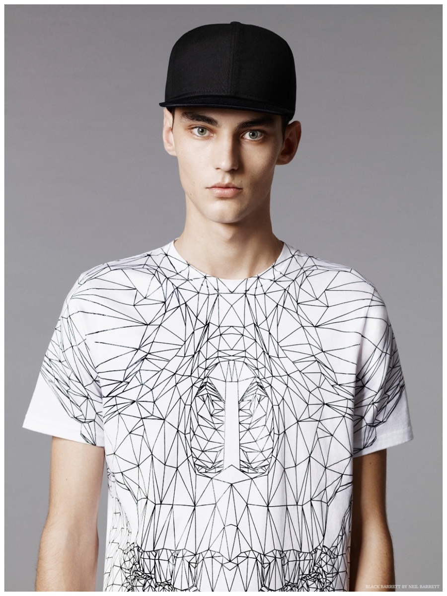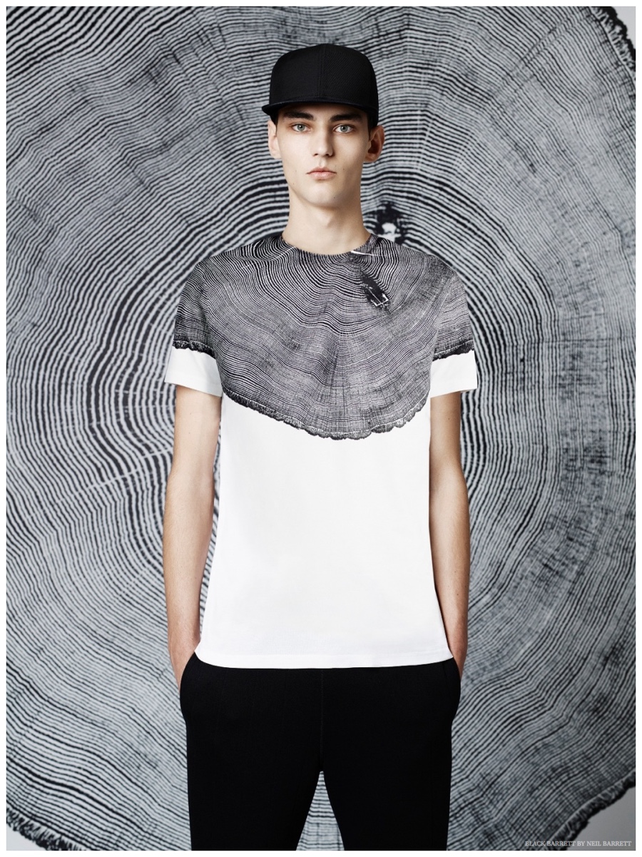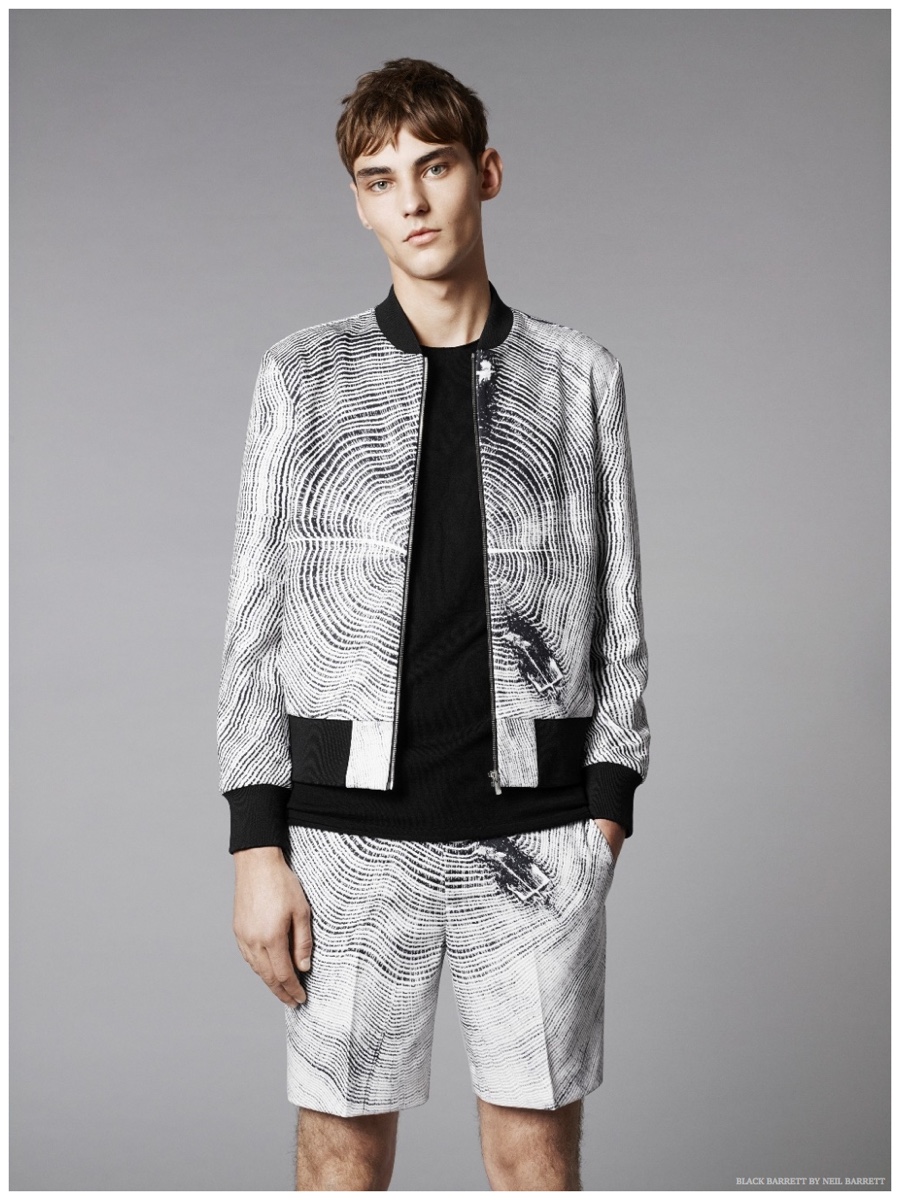 No stranger to a graphic print, Black Barrett by Neil Barrett delivers quite the fashionable edge for its spring 2015 collection. Embracing the classic color combo of black and white, the collection serves up relaxed essentials for the urban arena. MMO model Max Esken stars in the season’s lookbook, sporting t-shirts, bomber jackets, sweatshirts and suiting jackets with both geometric and abstract prints.
