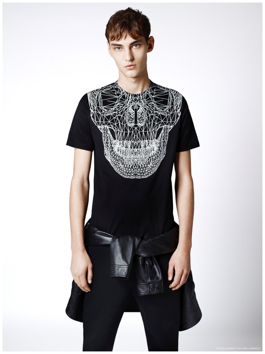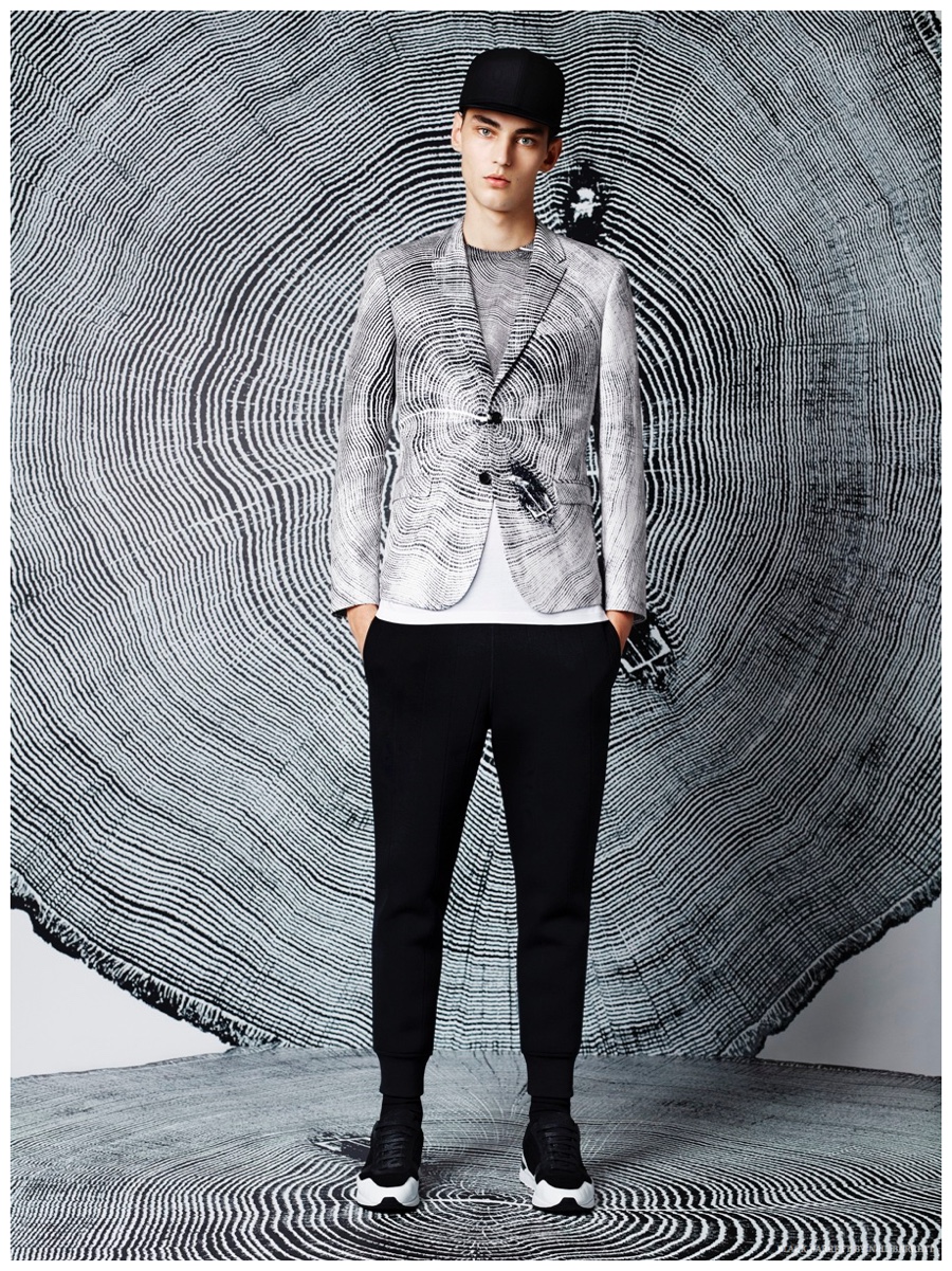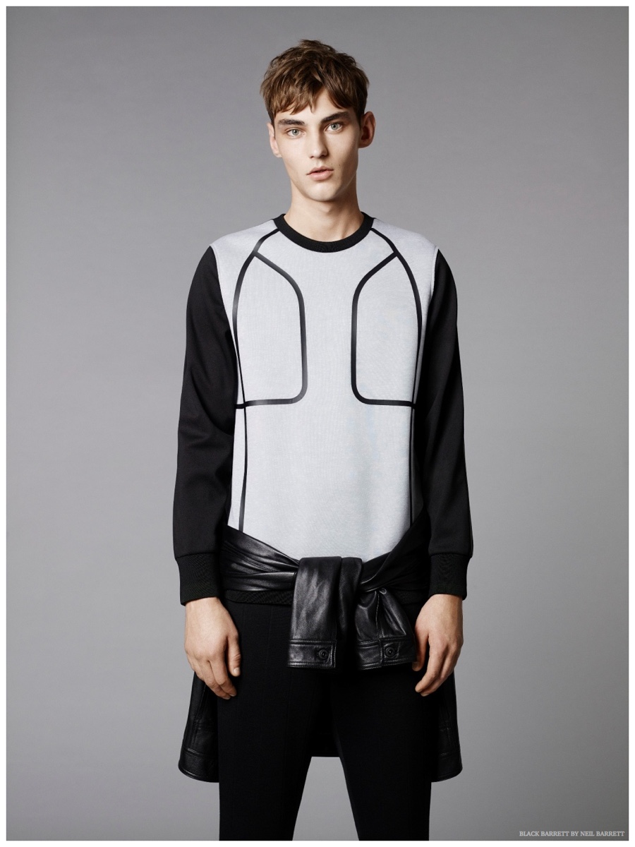 No stranger to a graphic print, Black Barrett by Neil Barrett delivers quite the fashionable edge for its spring 2015 collection. Embracing the classic color combo of black and white, the collection serves up relaxed essentials for the urban arena. MMO model Max Esken stars in the season’s lookbook, sporting t-shirts, bomber jackets, sweatshirts and suiting jackets with both geometric and abstract prints.