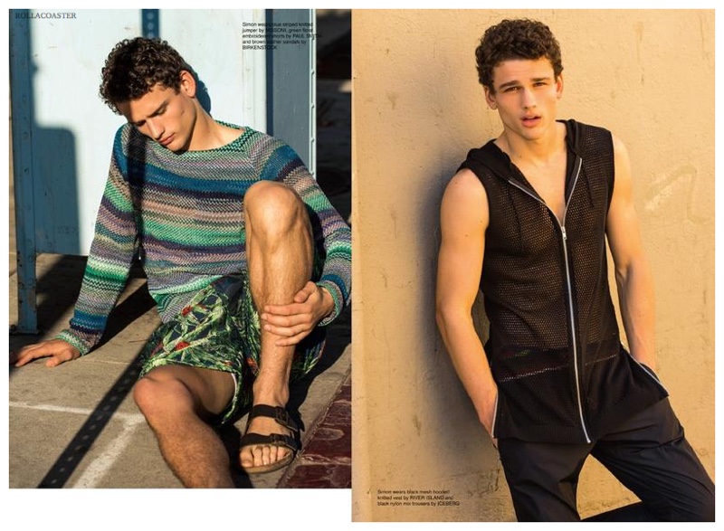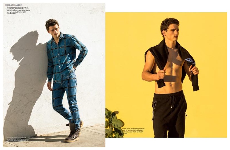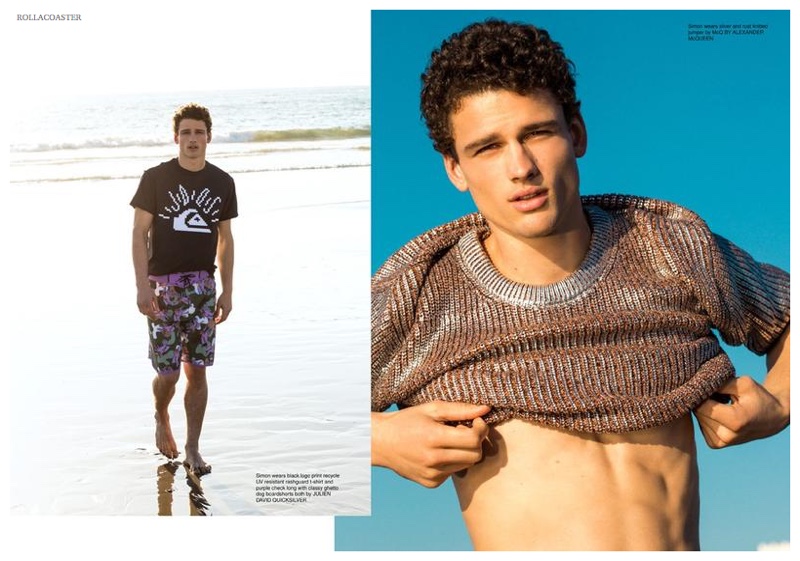 Leading Canadian model Simon Nessman connects with fashion photographer Greg Vaughan for the spring-summer 2015 cover story of English magazine Rollacoaster. Embracing spring in full force, Simon hits the beach in bright, youthful fashions. Outfitted by stylist Andrew Davis, Simon models pieces from Calvin Klein Collection, River Island, Moschino and more.
