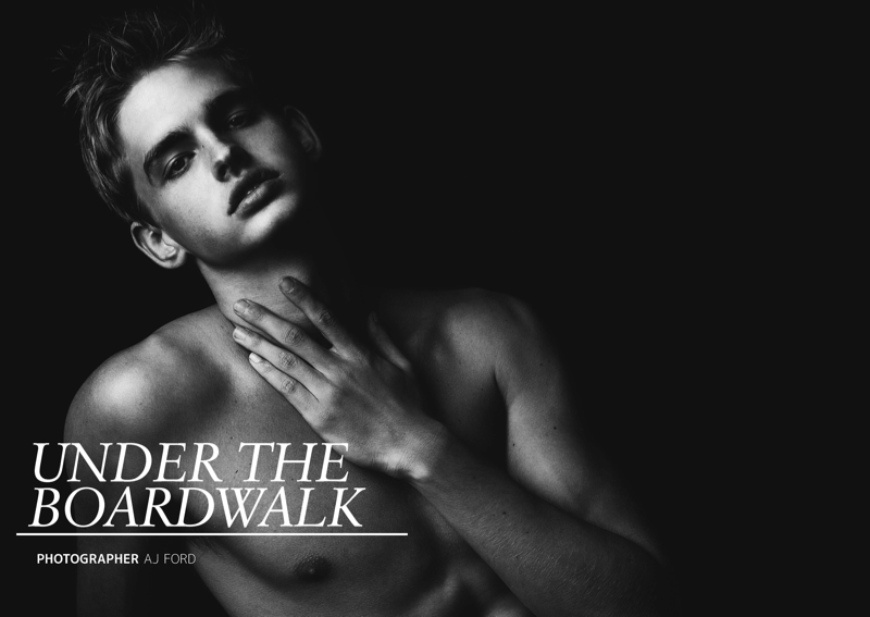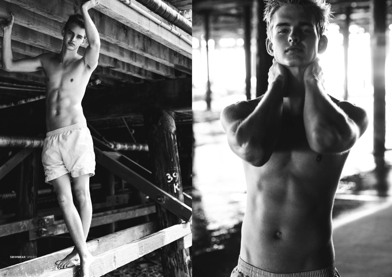 Under the Boardwalk–Fusion fresh face Dylan Hall connects with photographer AJ Ford for a simple shoot under the boardwalk for Jon magazine. Celebrating summer with a welcomed simplicity, Dylan is captured in classic black & white photography. Posing for the relaxed images, Dylan wears swimwear from Speedo and Tattee Boy.