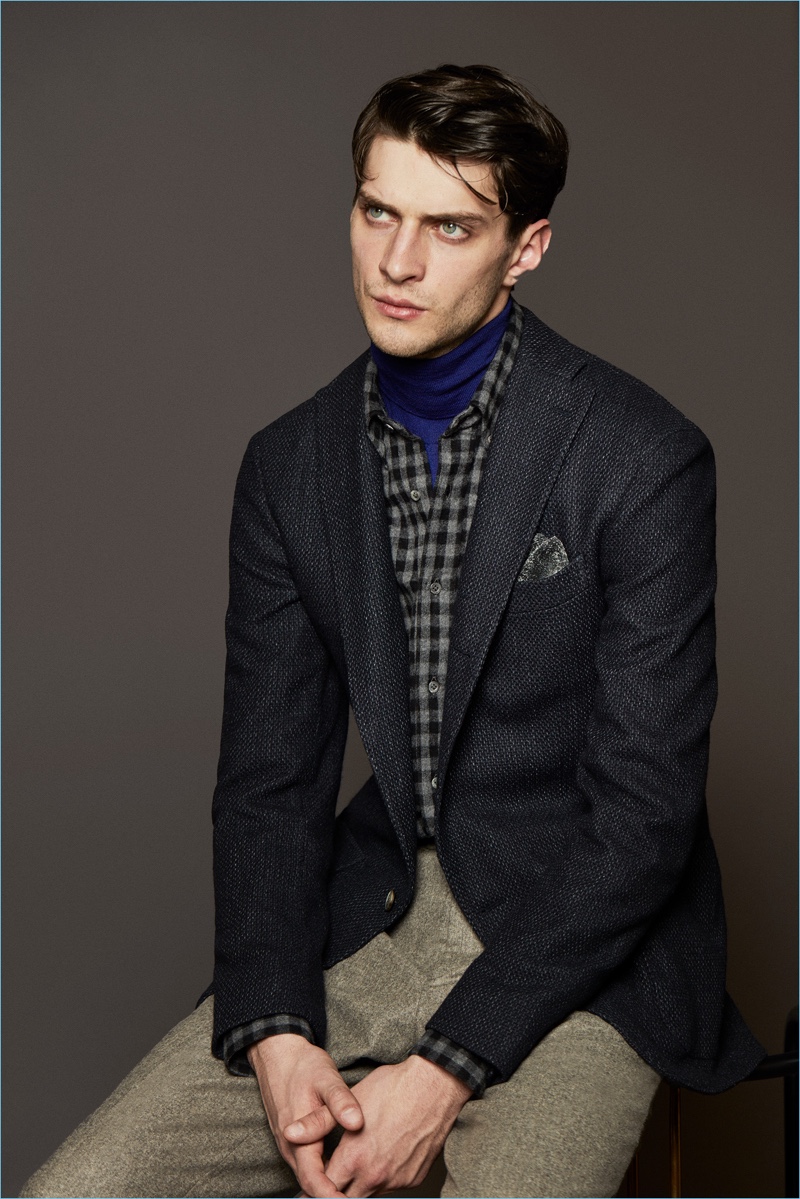 Capturing the beauty of storied histories, Marello finds a poetic narrative for the season. Here, cashmere, silk, and wool come together for a sartorial wardrobe. Starring in Boglioli’s lookbook, English model Matthew Bell dons irresistible ensembles for the contemporary gentleman. Checks, herringbone, and more classic prints dress a chic lineup of sports coats, turtlenecks, duffle coats, and trim trousers.
