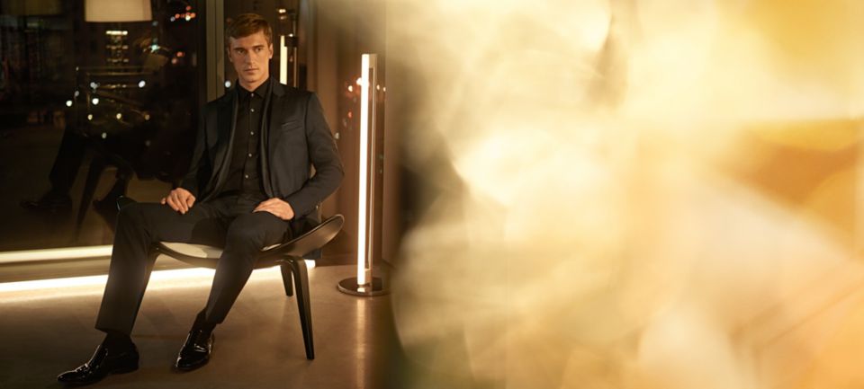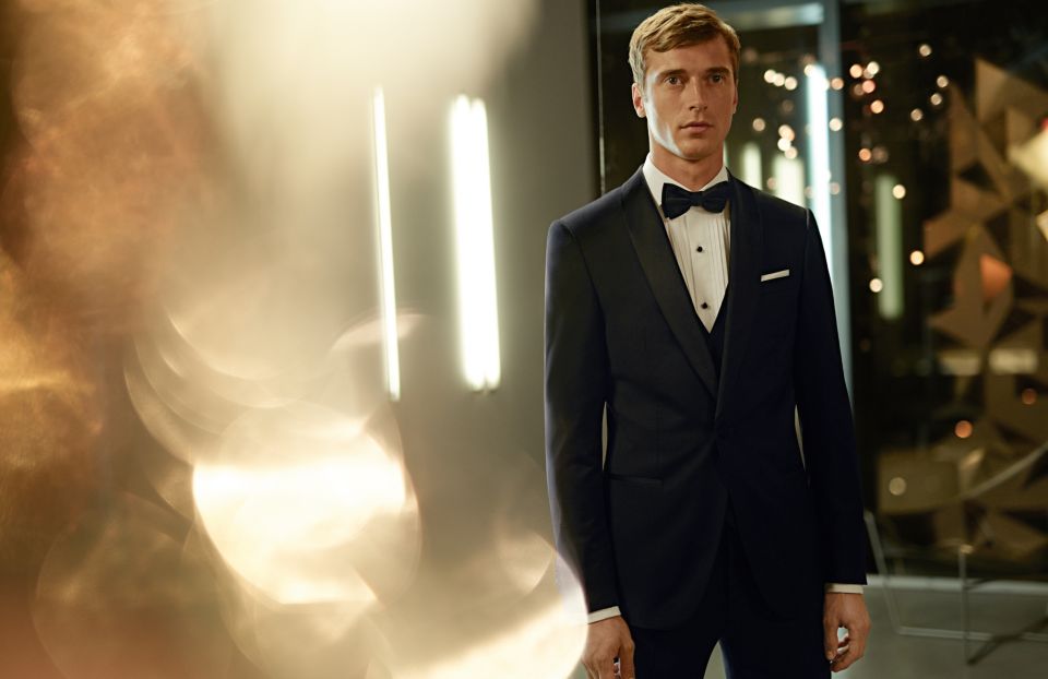 Clément Chabernaud models a dapper tuxedo for BOSS by Hugo Boss’ holiday 2015 campaign.